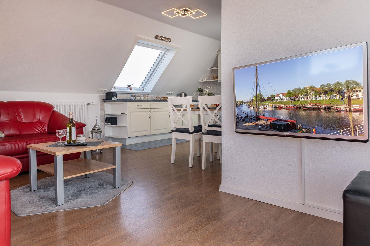 Die Ferienwohnung Inselblick in Carolinensiel bietet Komfort, Balkon mit Nordseeblick und Nähe zur Friedrichsschleuse.