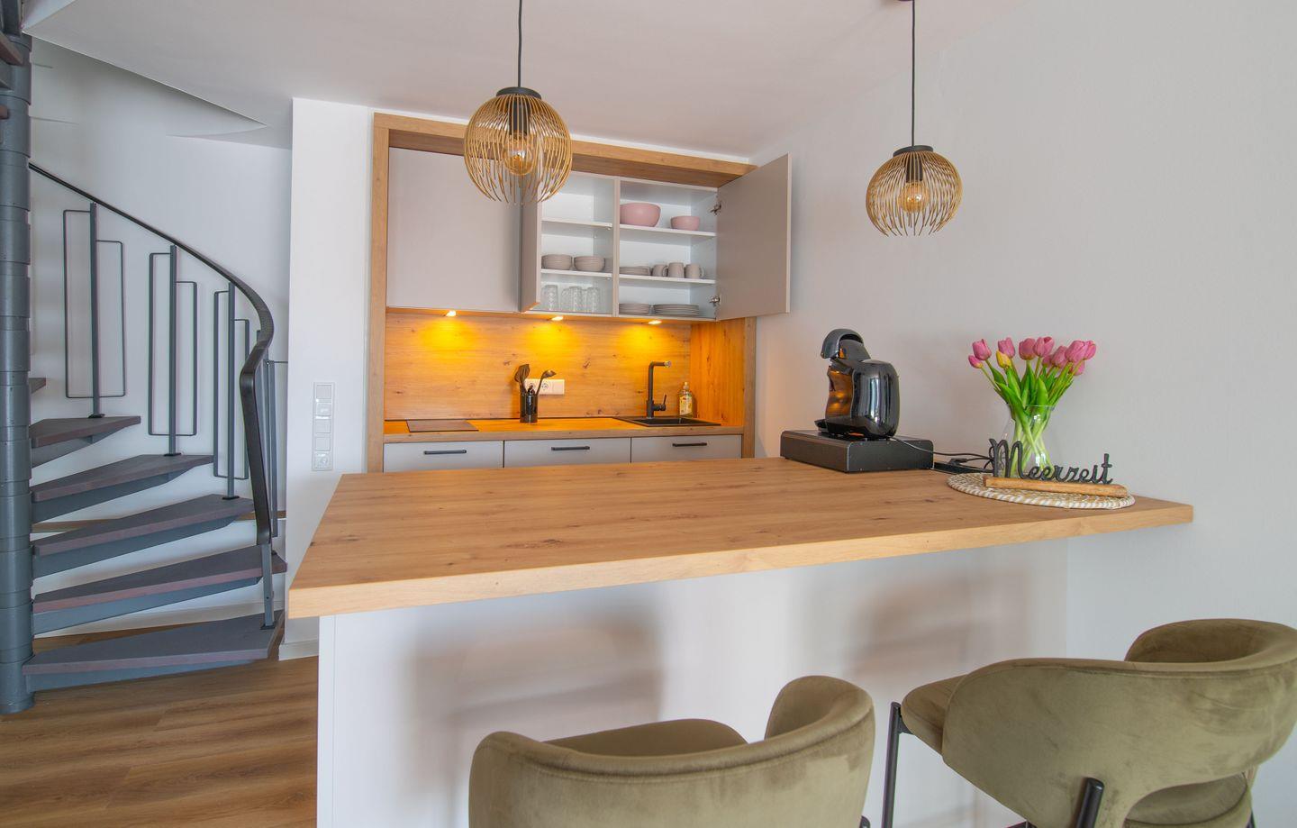 Willkommen in unserer exklusiven Ferienwohnung in Carolinensiel! Diese moderne Unterkunft bietet einladenden Komfort für einen Aufenthalt an der Nordseeküste. Genießen Sie die stilvoll eingerichtete offene Küche, das geräumige Wohnzimmer und das komfortable Schlafzimmer mit hochwertigen Möbeln und Designelementen.