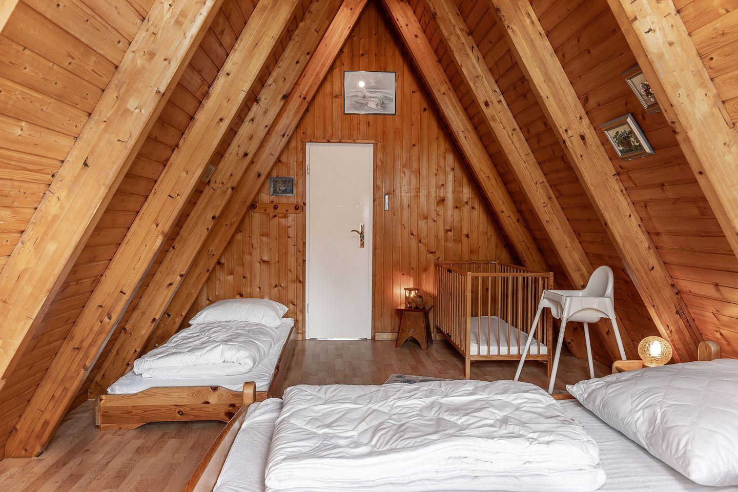 1 Schlafzimmer mit Doppelbett, 1 Einzelbett und 1 feststehendes Kinderbett
