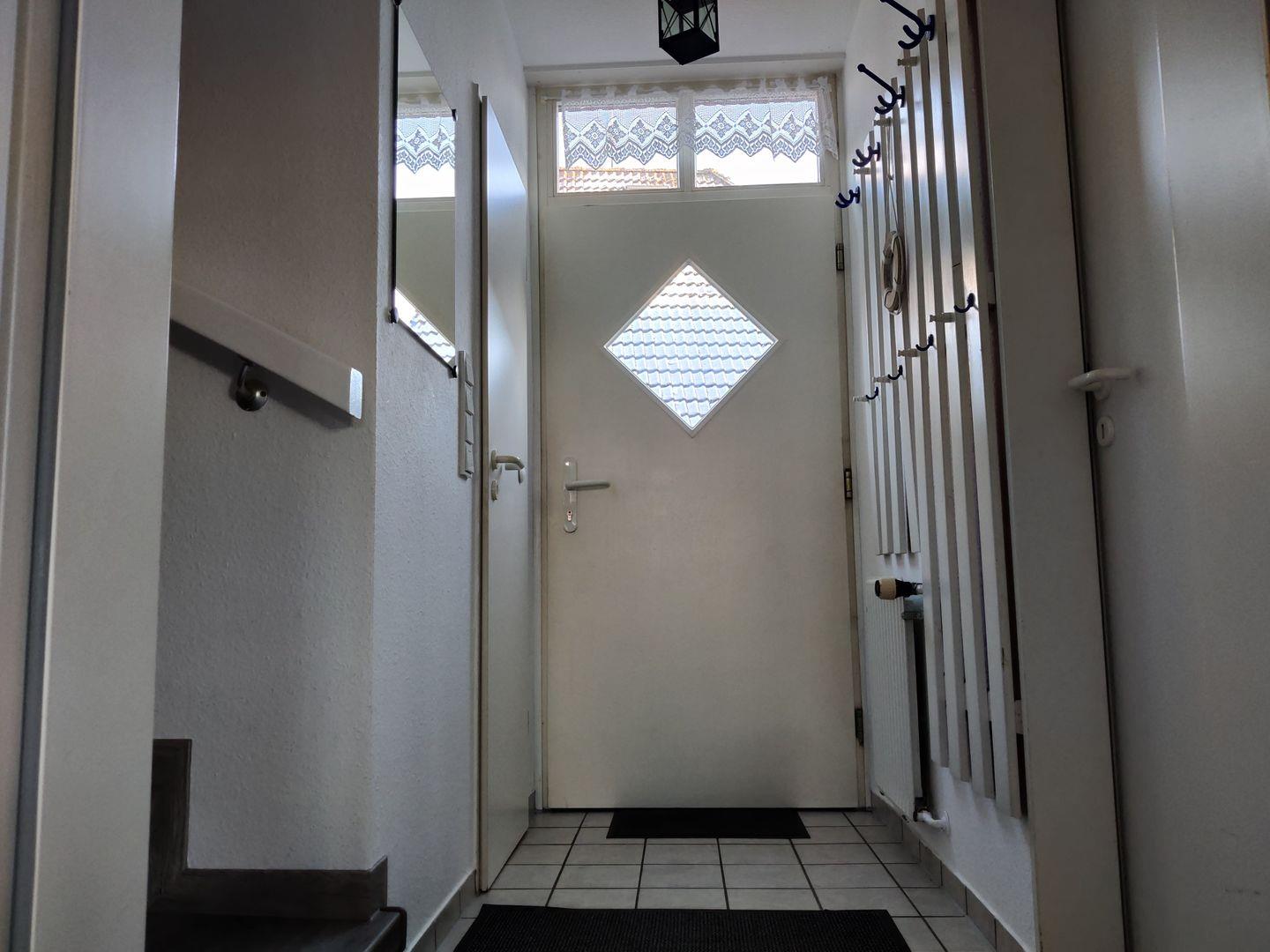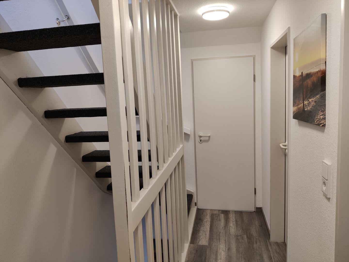 Im Erdgeschoss erwartet Sie eine voll ausgestattete Küche mit Elektroherd, Backofen, Geschirrspüler, Mikrowelle, Kaffeemaschine (Filterkaffee), Wasserkocher sowie einem Kühlschrank mit Gefrierfach. Selbstverständlich stehen ausreichend Geschirr, Besteck und Kochutensilien zur Verfügung. Der gemütliche Wohnbereich lädt mit einer komfortablen Couch, Sessel, Flachbild-TV und Radio zum Entspannen ein. Am ausziehbaren Esstisch mit Stühlen und Eckbank können Sie gemeinsame Mahlzeiten genießen. Kostenfreies WLAN ist im gesamten Haus verfügbar. Ergänzt wird das Erdgeschoss durch ein Gäste-WC sowie einen praktischen Abstellraum mit Staubsauger, Wäscheständer, Bügelbrett und Bügeleisen.