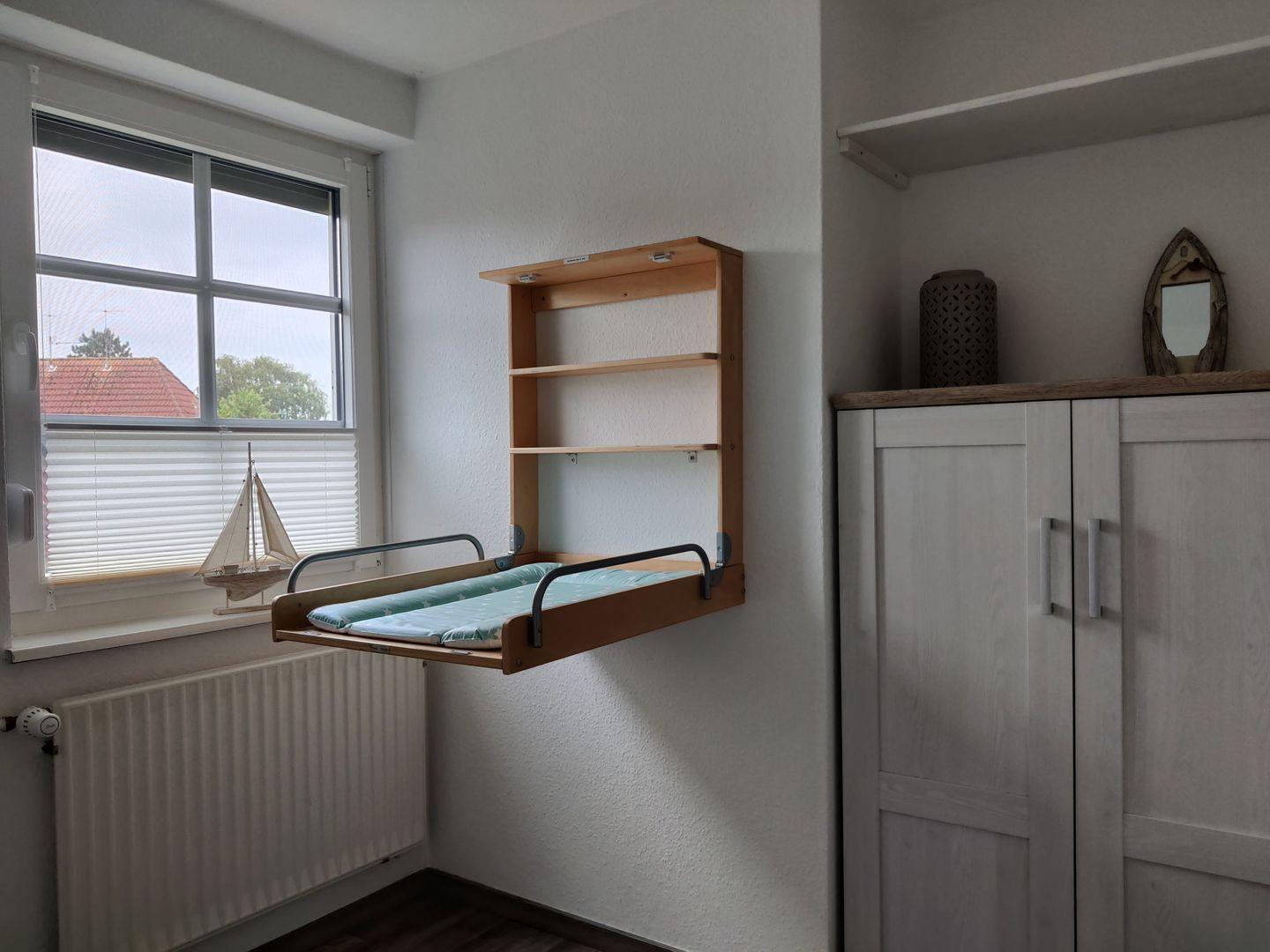 Im 1. Obergeschoss befinden sich zwei Schlafzimmer: eines mit einem komfortablen Doppelbett (180 × 200 cm) und Kleiderschrank, sowie ein weiteres Schlafzimmer mit zwei Einzelbetten (90 × 200 cm), Wickeltisch und Kommode – ideal für Familien mit kleinen Kindern. Das Badezimmer ist mit Dusche, WC und Waschmaschine ausgestattet.