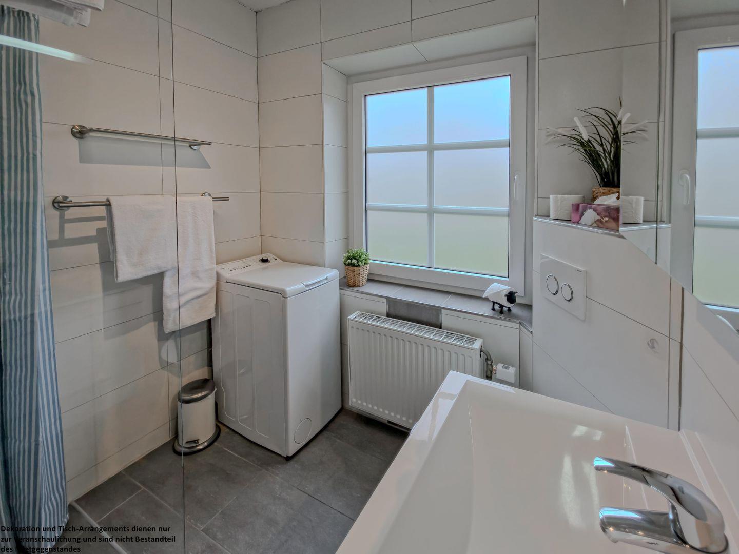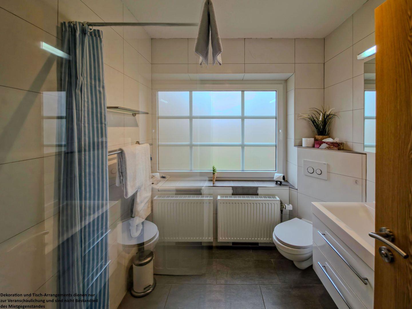 Das helle Tageslichtbad überzeugt mit einer bodengleichen Dusche und freundlichen Fliesen, die eine angenehme Wohlfühlatmosphäre schaffen.