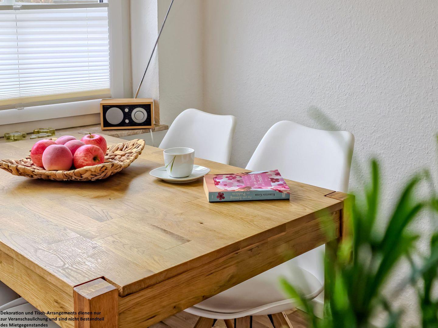 Das Herzstück der Wohnung ist das großzügige Wohnzimmer. Hier erwartet Sie ein gemütliches L-Sofa, das zu entspannten Stunden vor dem Fernseher einlädt. Die angrenzende Essgruppe mit massiven Stühlen schafft Raum für gemeinsame Mahlzeiten, Spieleabende und schöne Gespräche. Ein bequemer Sessel bietet zudem einen ruhigen Rückzugsort – perfekt für ein gutes Buch und einen Moment ganz für sich.