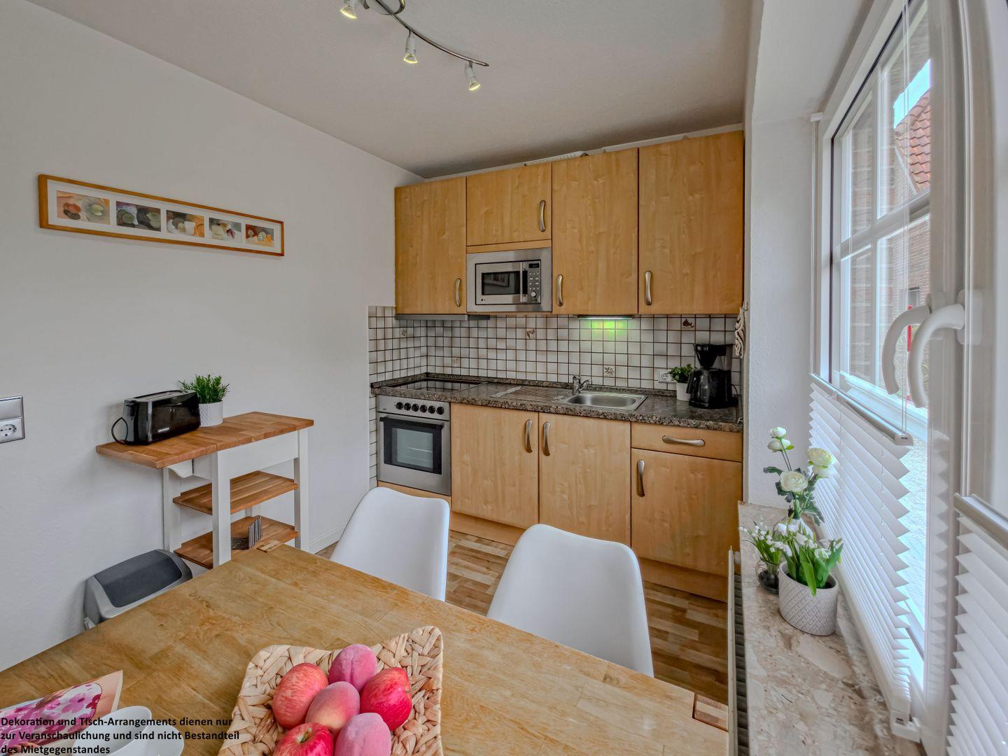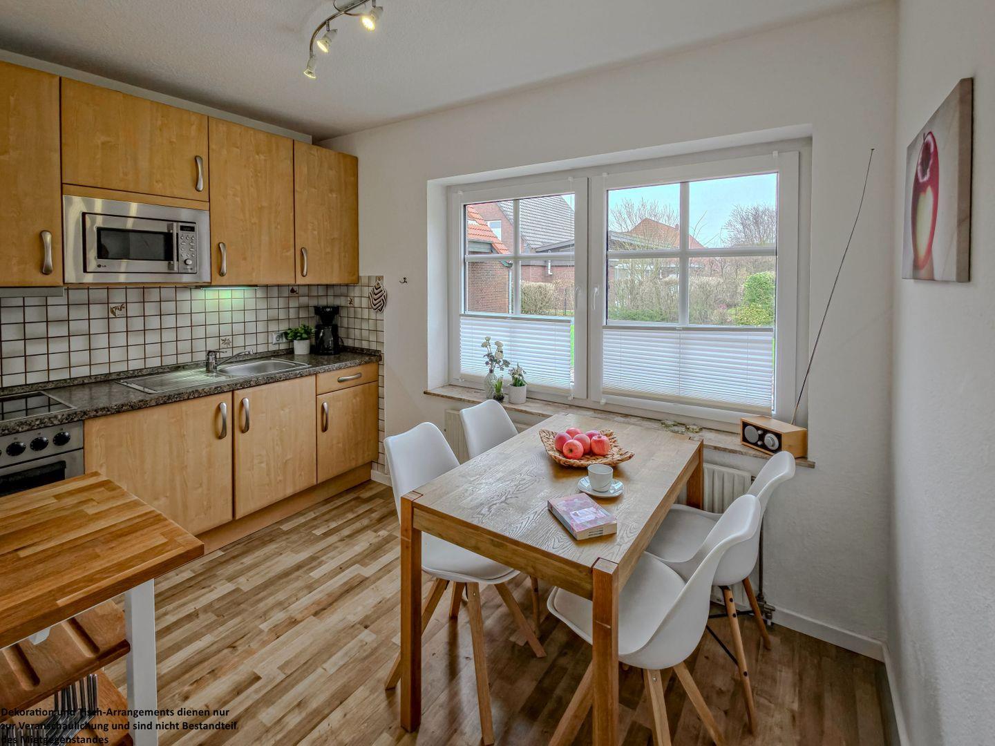 Die separate, moderne Küche lässt keine Wünsche offen und ist vollständig ausgestattet für Ihre Selbstversorgung. Auch hier lädt eine kleine Essgruppe dazu ein, den Tag bei einem Frühstück oder einem gemütlichen Abendessen zu genießen.
