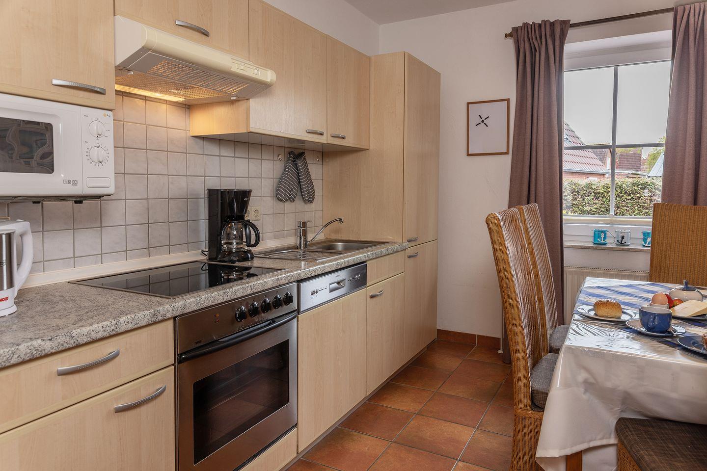 Diese Ferienwohnung besticht durch eine liebevolle Einrichtung und hat eine komplett ausgestattete Küche mit Spülmaschine, Herd, Backofen, Mikrowelle, Kühlschrank mit Gefrierfach und weiteren diversen Küchengeräten.