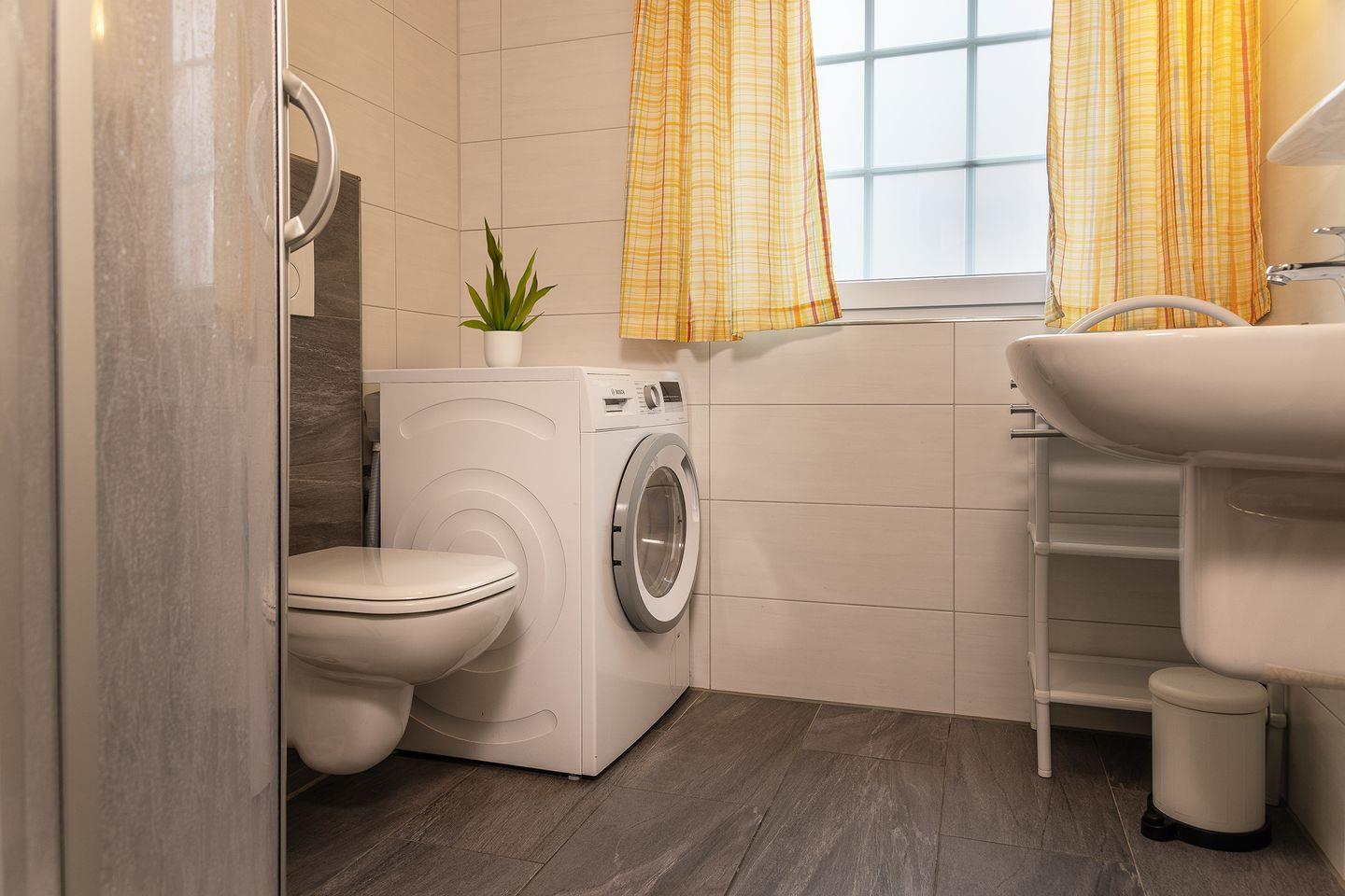 Bad mit Dusche, WC sowie Waschmaschine