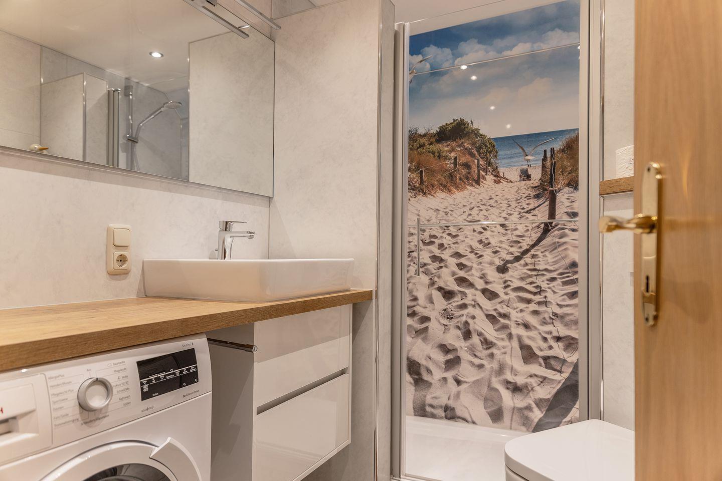 Dusche und WC und Waschmaschine, 1 Schlafzimmer mit Doppelbett