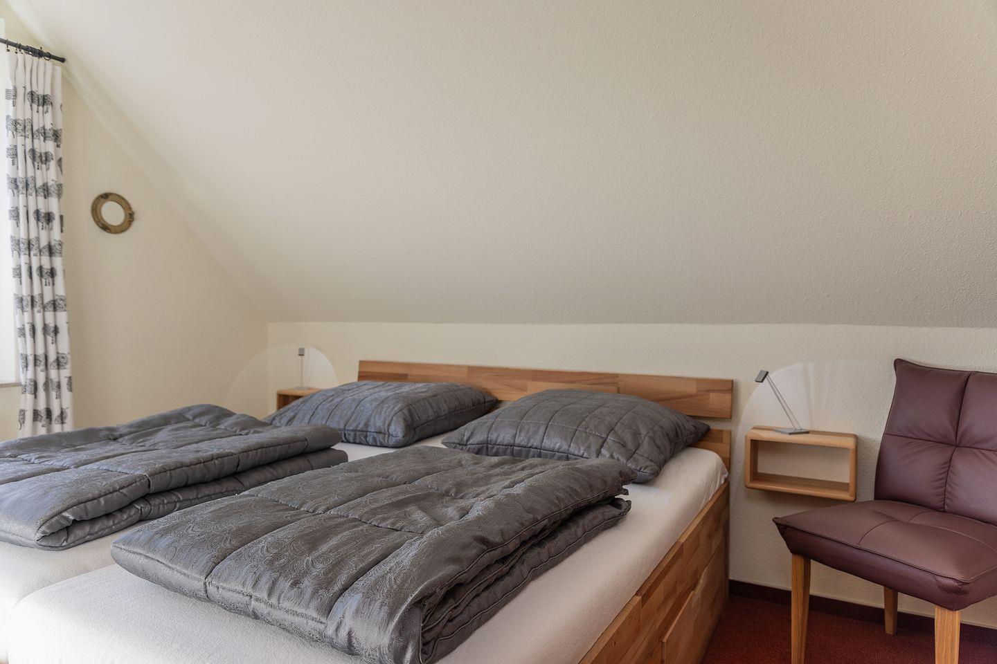 Schlafzimmer mit 2 Einzelbetten, Fernseher mit DVD- Player und Kinderbett