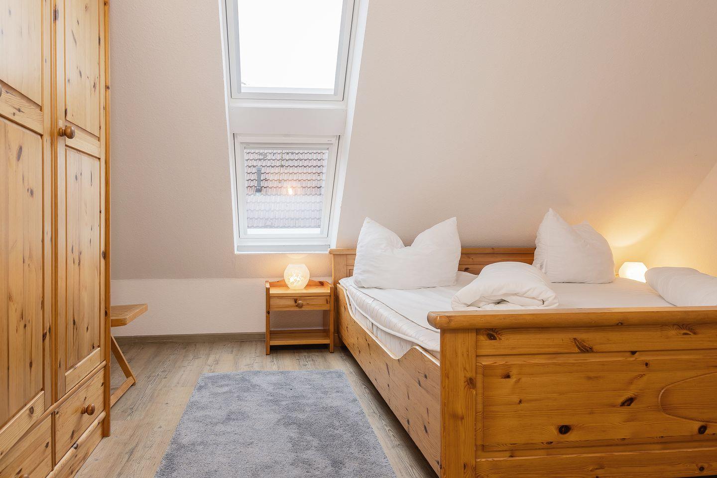 1 Schlafzimmer mit Doppelbett, 1 kleines Schlafzimmer mit 2 Einzelbetten (Kojenbett), Bad mit Dusche, WC und Waschmaschine.