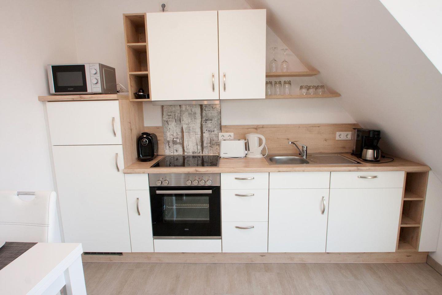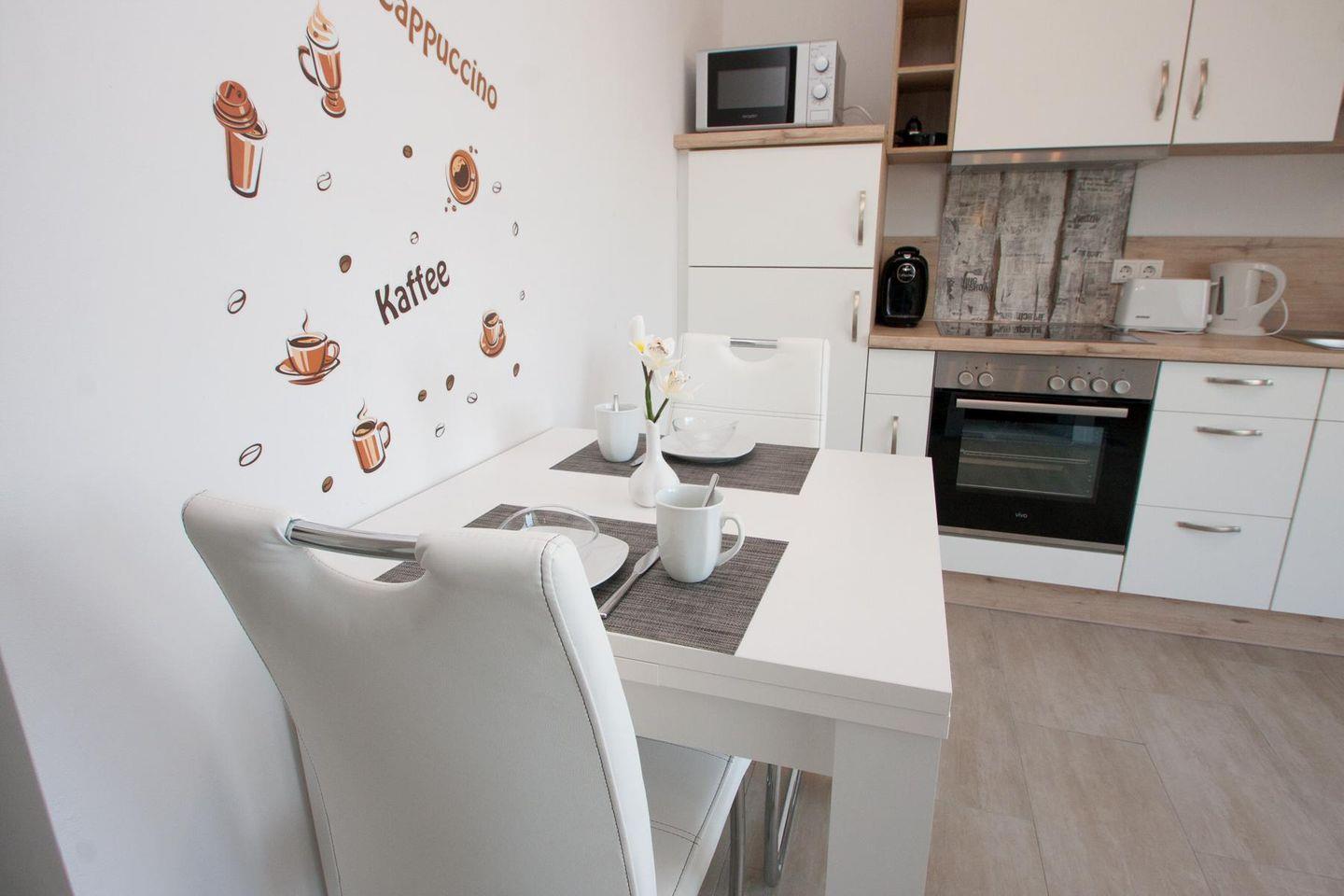 angrenzende komplette Küchenzeile mit Spülmaschine, Philips Kapsel-Kaffeemaschine etc. sowie Essbereich