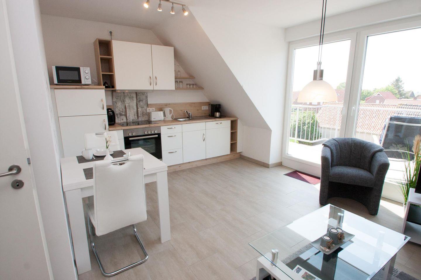 Gemütliche Obergeschosswohnung in Carolinensiel mit Balkon, moderner Küche und Fahrradabstellraum, ideal für Familien.