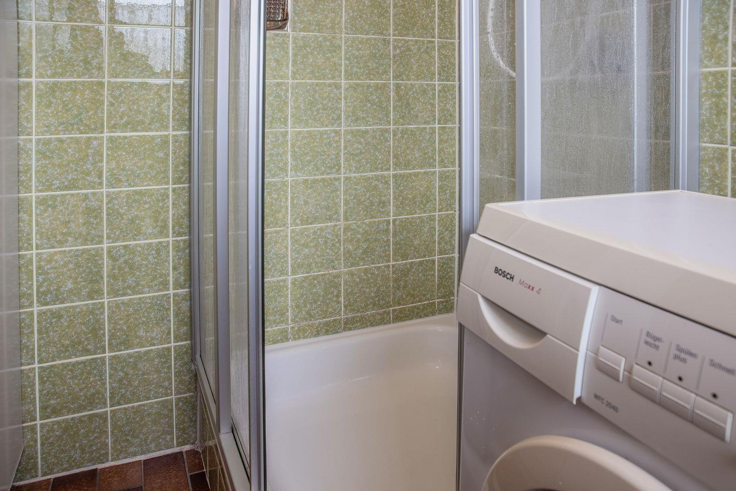 Badezimmer mit Dusche, WC und Waschmaschine.