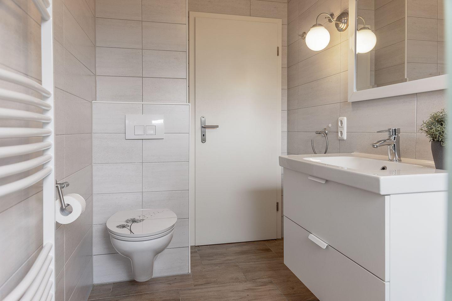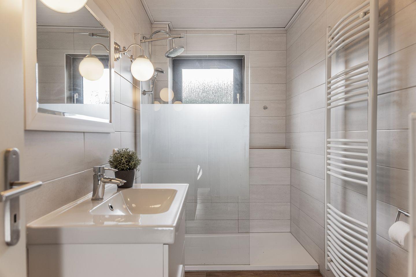 große Dusche mit Regendusche, Toilette, Handwaschbecken & Haartrockner