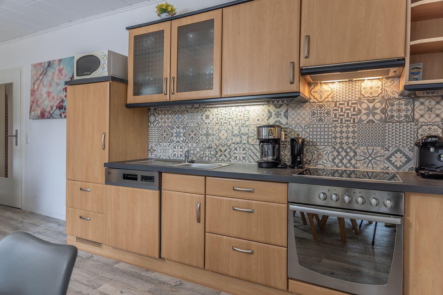 Essgruppe und komplett ausgestattete Küchenzeile u.a. mit Herd, Backofen, Kühlschrank mit Gefrierfach, Mikrowelle, Kapselkaffeeautomat, Filterkaffeemaschine und weiteres Küchenzubehör