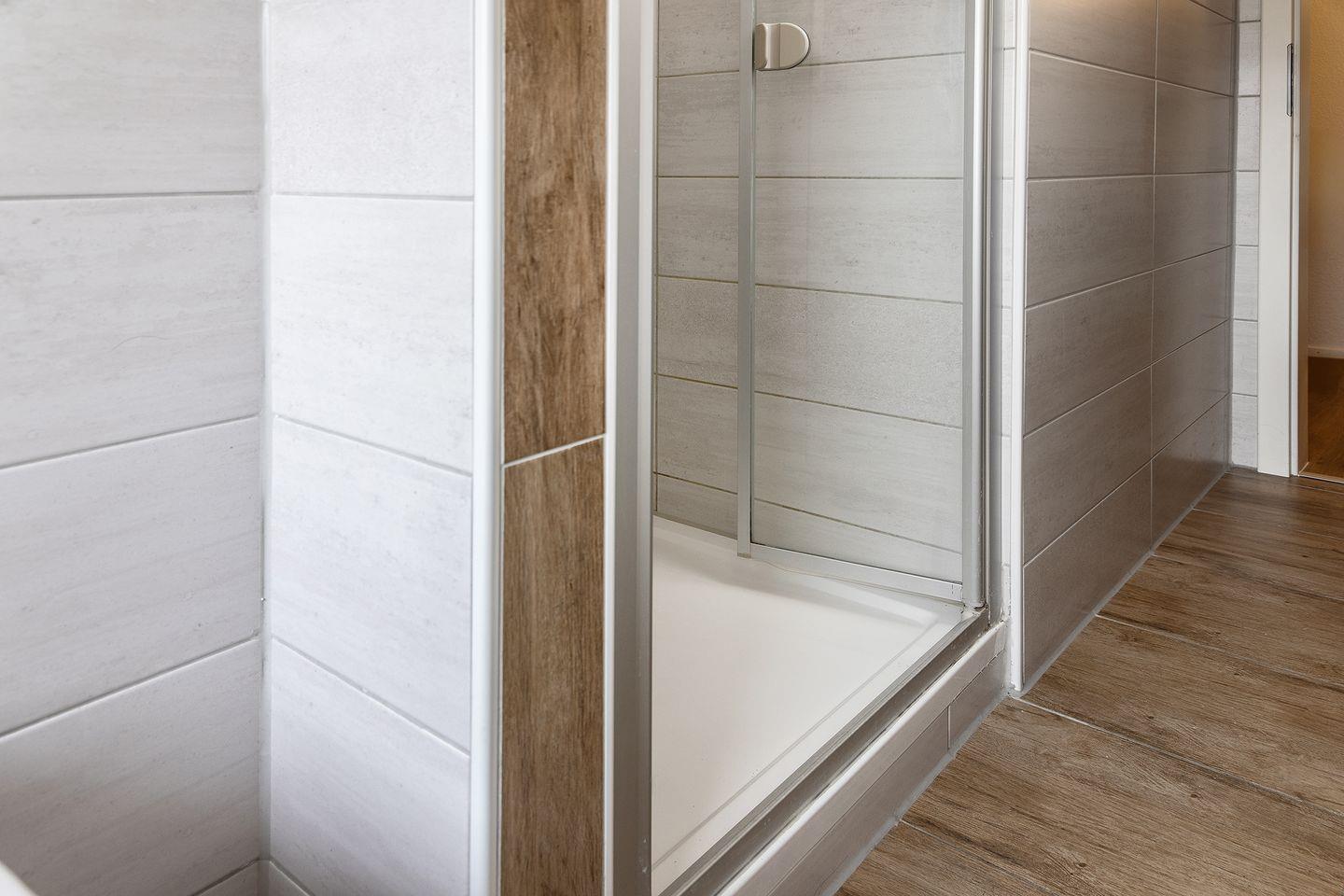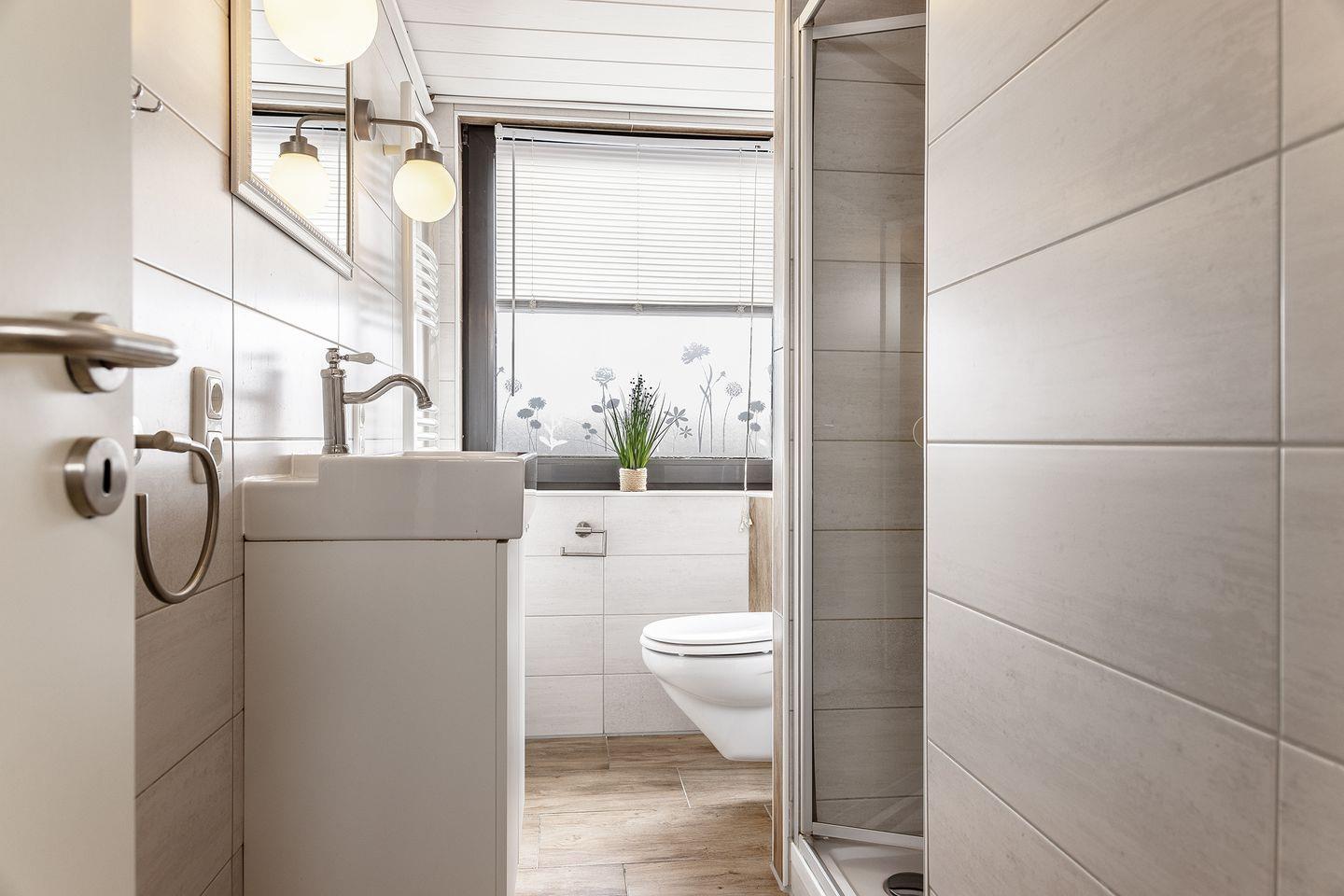 Dusche mit Regendusche, Toilette, Handwaschbecken & Haartrockner