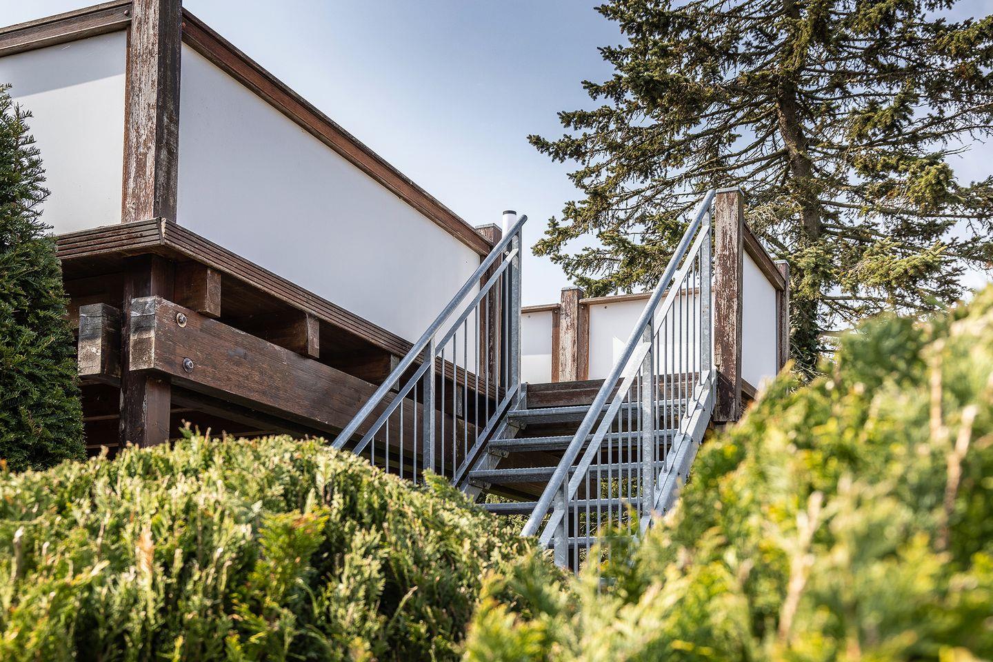 private Terrasse mit Gartenmöbeln, zwei Sonnenliegen und Sonnenschirm