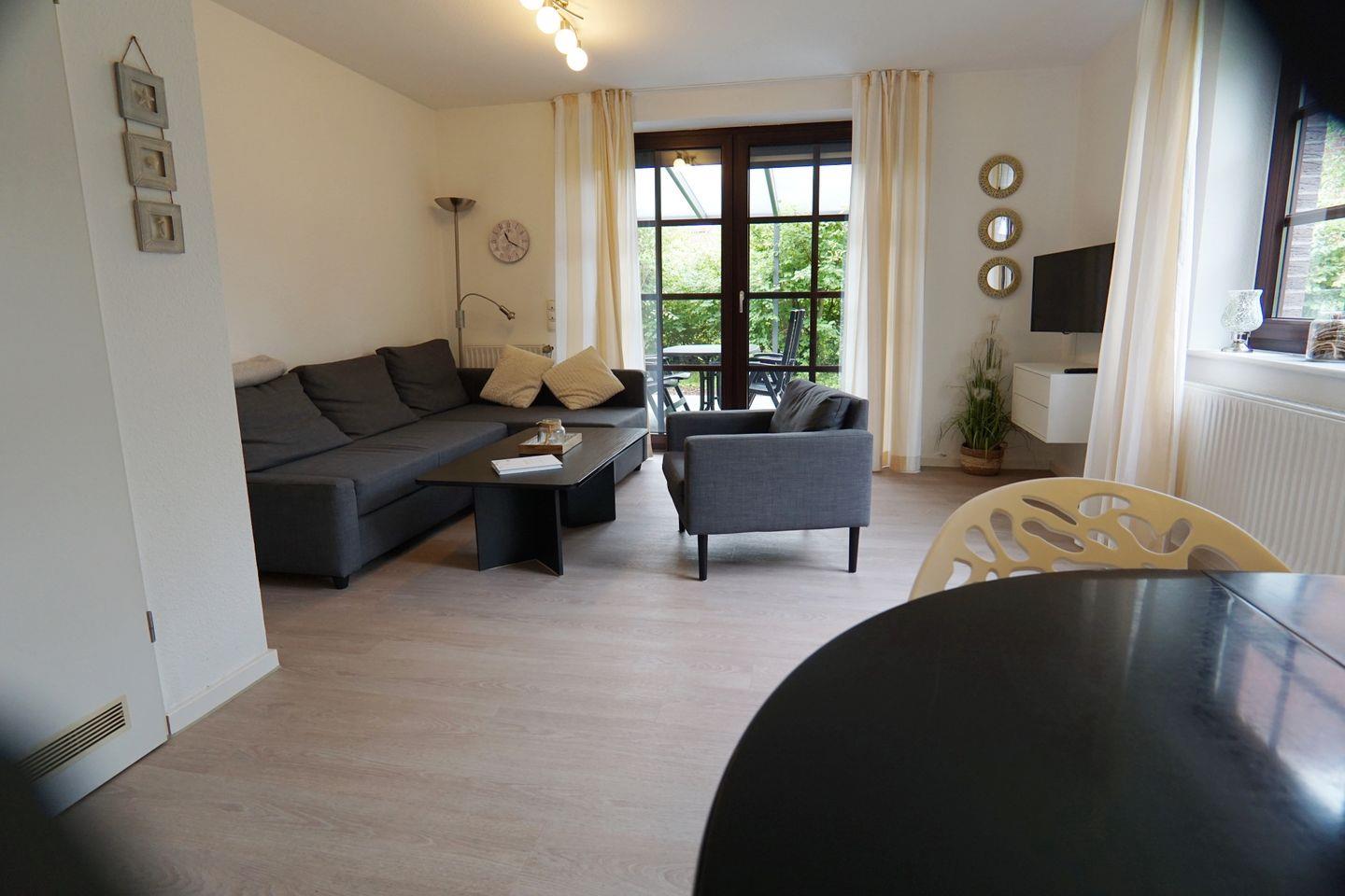 Wohn-/Esszimmer mit Sat- TV, Radio, Kinderhochstuhl. Separate Küche, Gäste- WC, Abstellraum, Terrasse mit kleinem Garten in Südlage, Gartenmöbel.