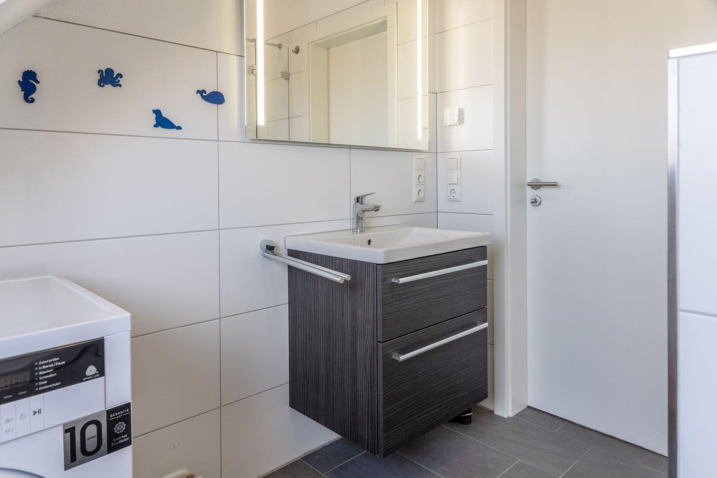 Bad mit ebenerdiger Dusche und WC, sowie einer Waschmaschine.