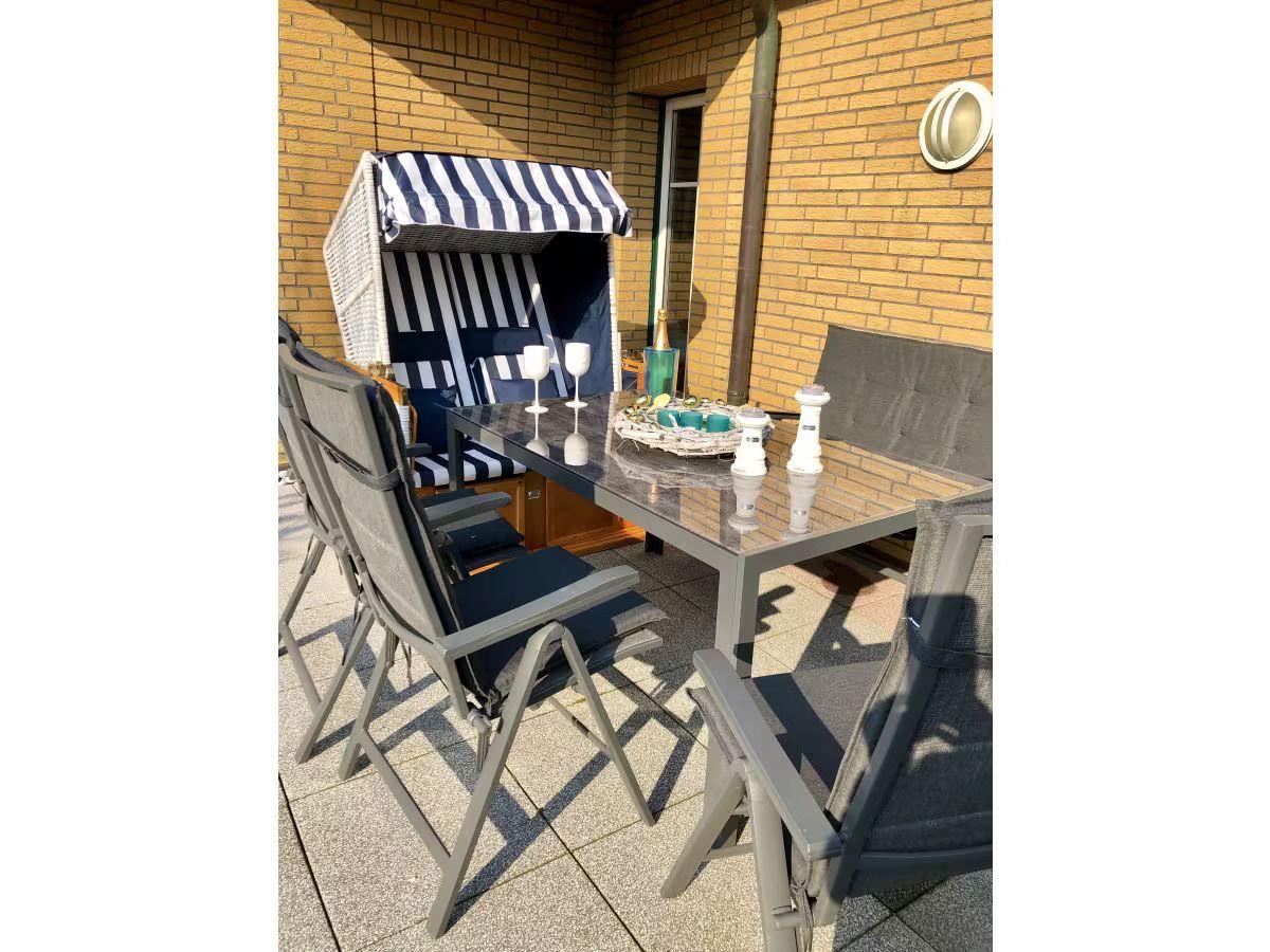 Von dort gelangen Sie auch auf die schöne, Sonnenterrasse mit ansprechenden Gartenmöbeln/ Strandkorb, abschließbarem Gartenhaus, großen Carport (mit abschließbaren Tor) und eingezäunten (durch Hecken) Garten.