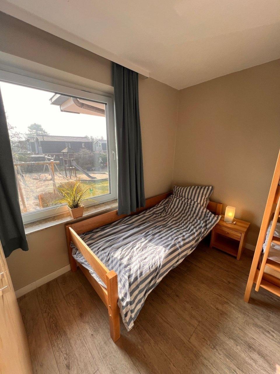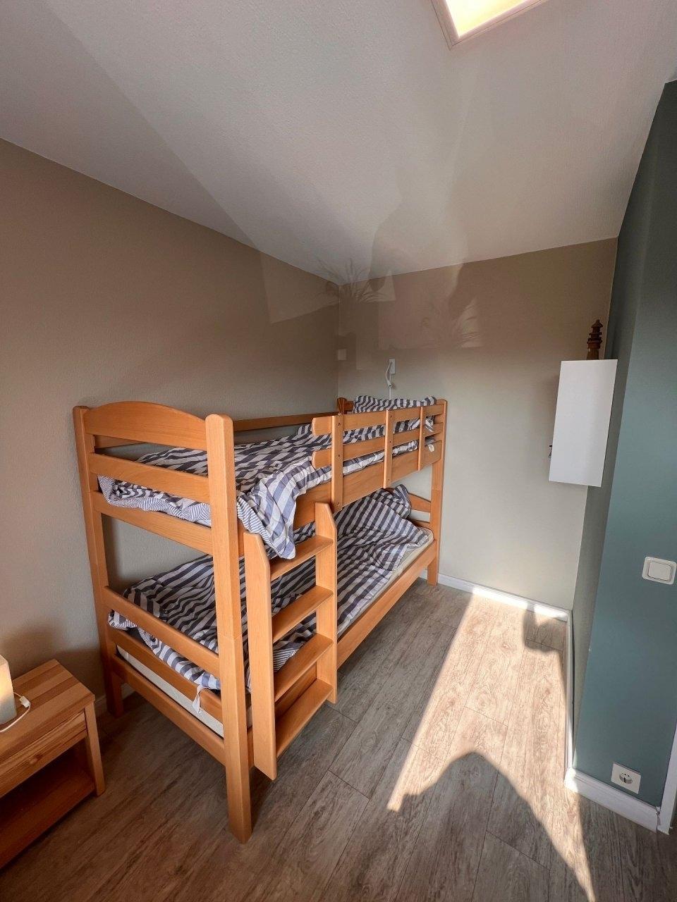 - Ein großzügiges Kinderzimmer mit drei Betten ideal für Familien mit drei Kindern, damit alle ihren eigenen Schlafplatz haben.