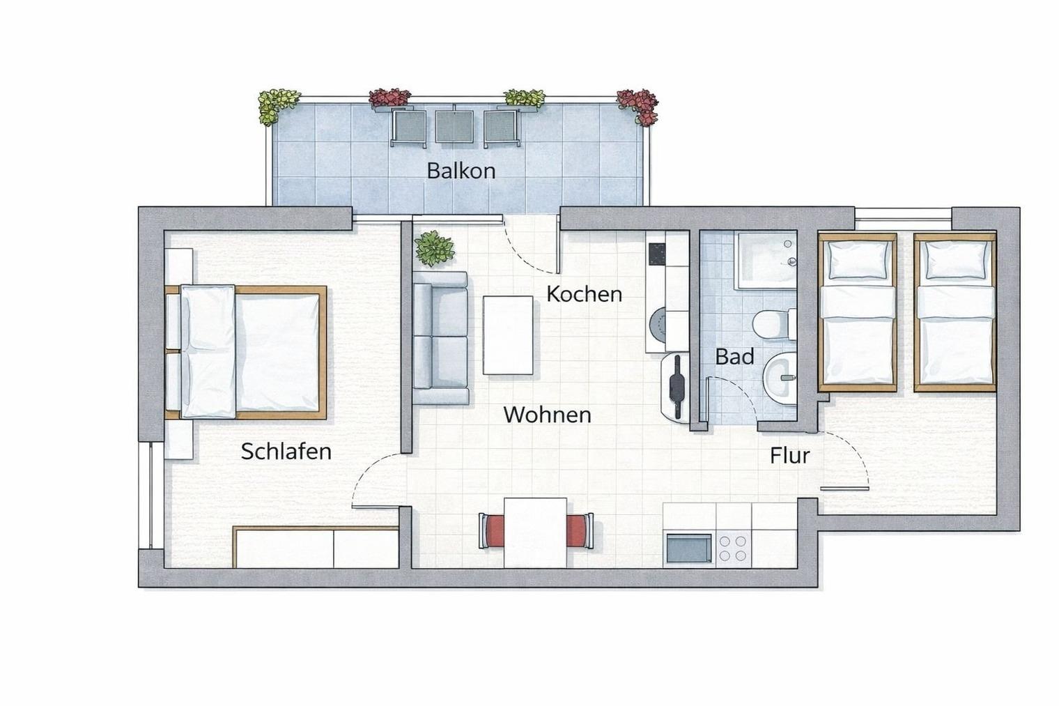 3-Zimmer-Wohnung (ca. 50 qm) mit 2 Schlafzimmern