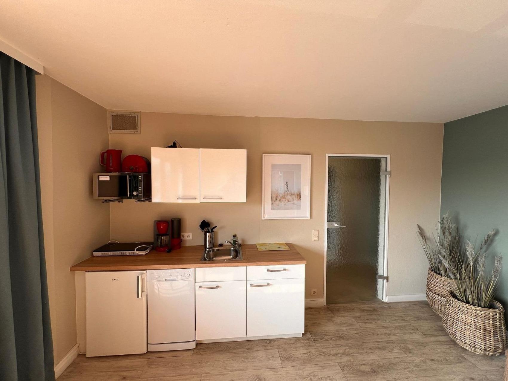 - Einen hellen Wohnbereich mit Sofa, zwei Sesseln, TV und integrierter Küche inklusive Spülmaschine, Mikrowelle und Kühlschrank.