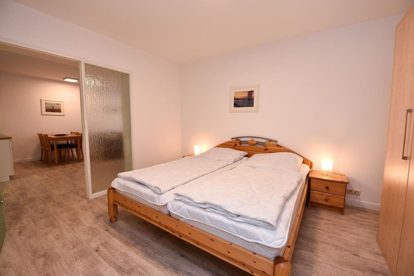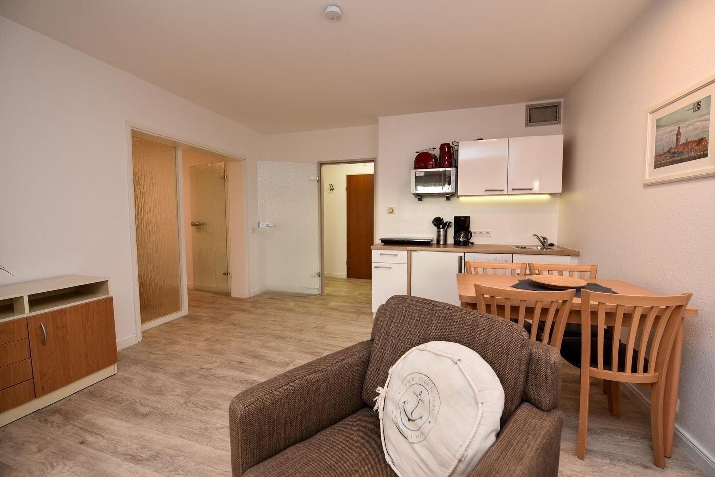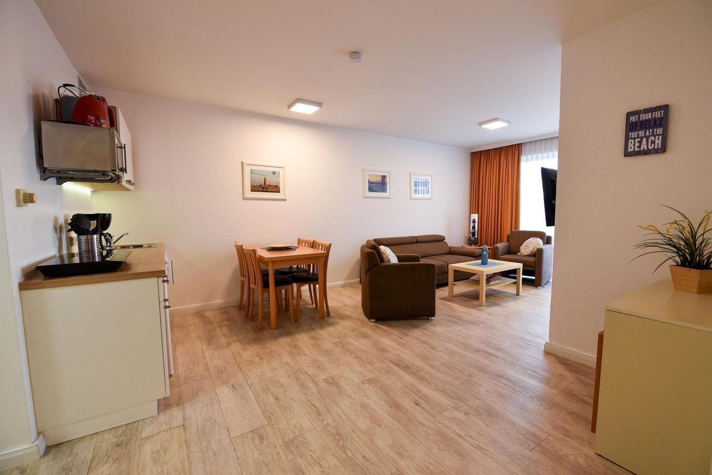 3-Zimmer Appartement im Haus "Nige Wark", bestehend aus einem Kinderzimmer mit Etagenbett und einem Schlafzimmer mit Doppelbett. Der Wohnraum ist mit einer gemütlichen Couch, zwei Sesseln und Flat- TV ausgestattet. Die im Wohnraum integrierte Küchenzeile bietet u.a. Spülmaschine, Mikrowelle und Kühlschrank mit Gefrierfach. Am ausziehbare Esstisch gibt es genügend Platz für die ganze Familie. Das geräumige Appartement verfügt über 2 Badezimmer, die jeweils mit einer Dusche und WC ausgestattet sind. Größe der Wohnung, die im Hochparterre liegt und einen Südbalkon zum Garten hat, ist ca. 50qm.