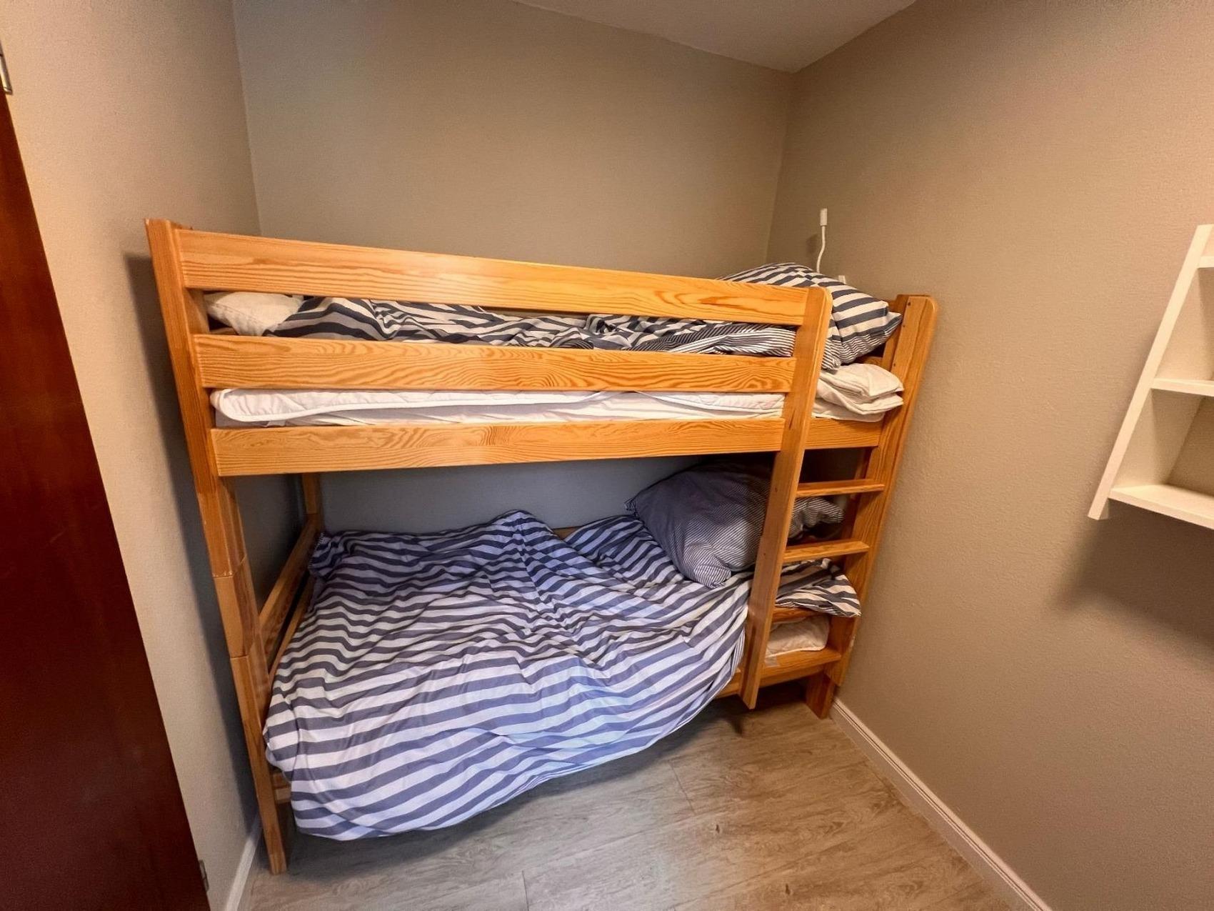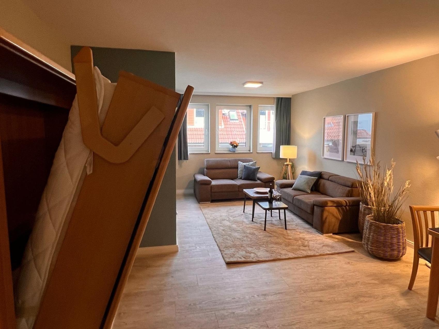 Die Unterkunft verfügt über ein gemütliches Schlafzimmer mit Etagenbett und ein helles Wohnzimmer mit zwei bequemen Zweisitzer-Sofas, Flat-TV und einer voll ausgestatteten Küchenzeile inklusive Spülmaschine, Mikrowelle und Kühlschrank mit Gefrierfach. Ein ausziehbarer Esstisch bietet ausreichend Platz für gemeinsame Mahlzeiten. Zusätzlich sorgt ein Schrankbett (2×90×200 cm) für flexible Schlafmöglichkeiten.
