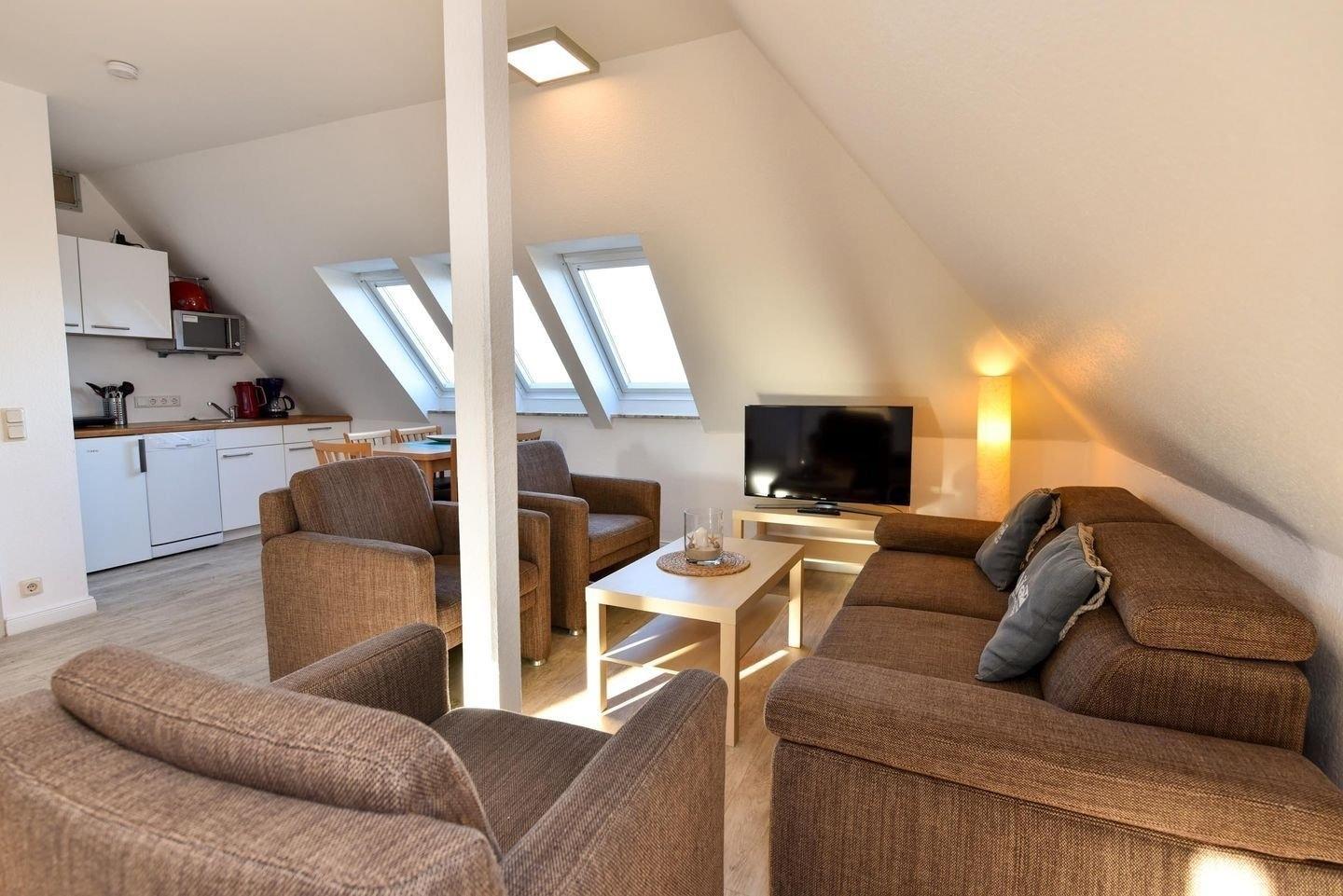 3-Zimmer Appartement im Haus "Nige Wark". In der TV-/Leseecke im Wohnzimmer befindet sich ein gemütliches Zweisitzer-Sofa, drei Sessel und ein Flat- TV. Die integrierte Küchenzeile mit Spülmaschine, Mikrowelle und Kühlschrank mit Gefrierfach ist komplett ausgestattet und der ausziehbare Esstisch, von welchem aus Sie einen herrlichen Blick auf das UNESCO-Weltnaturerbe Wattenmeer, die Insel Neuwerk und den Weltschifffahrtsweg haben, bietet genügend Platz für alle. Im Wohn-/Schlafraum befindet sich zusätzlich noch ein ein Schrankbett (2x90x200). In den 2 Schlaf-/Kinderzimmern stehen jeweils 2 Einzelbetten (90x200). Das Badezimmer ist mit einer Dusche und WC ausgestattet. Die ca. 50 qm große Wohnung liegt im 2. OG.