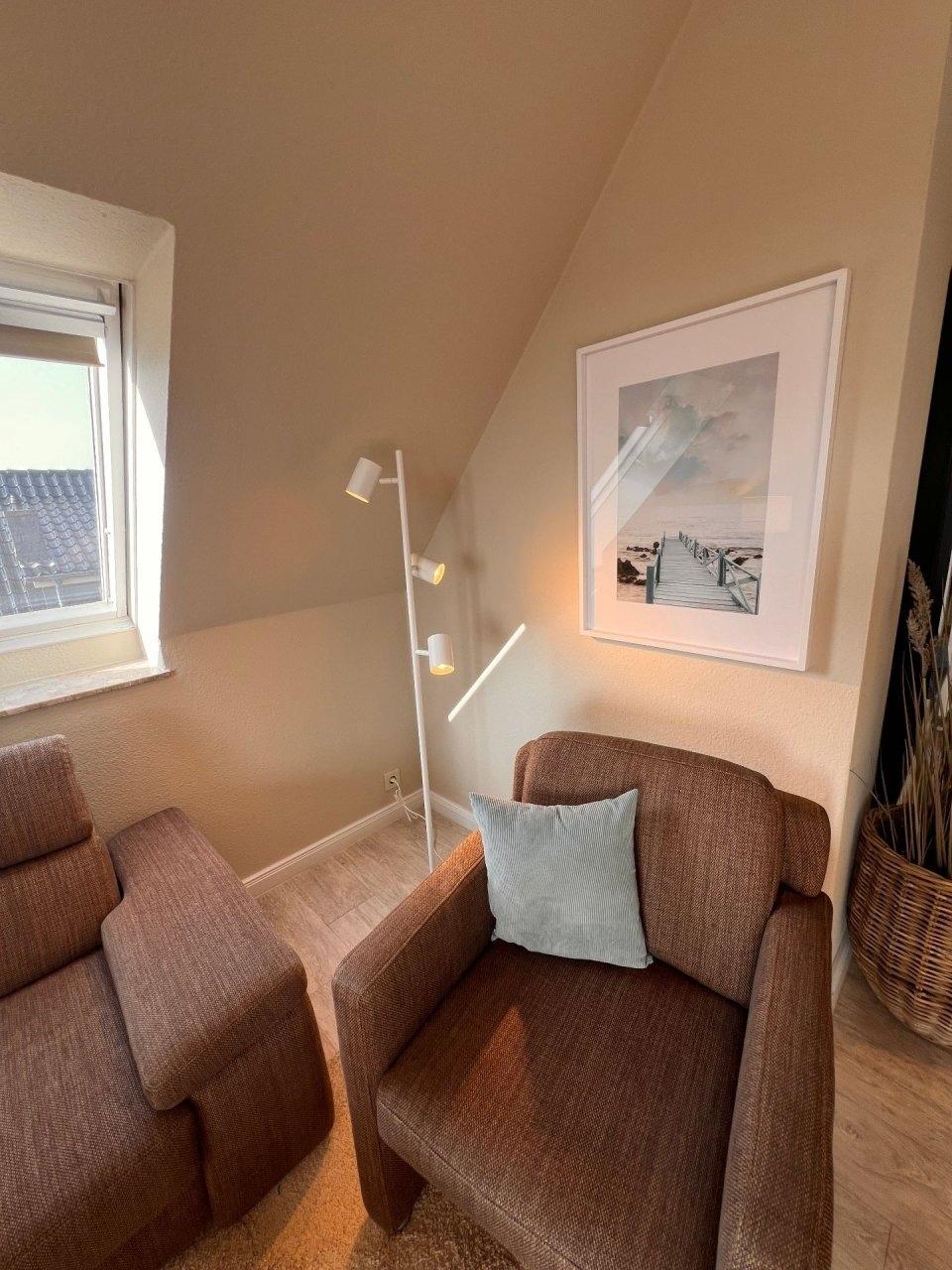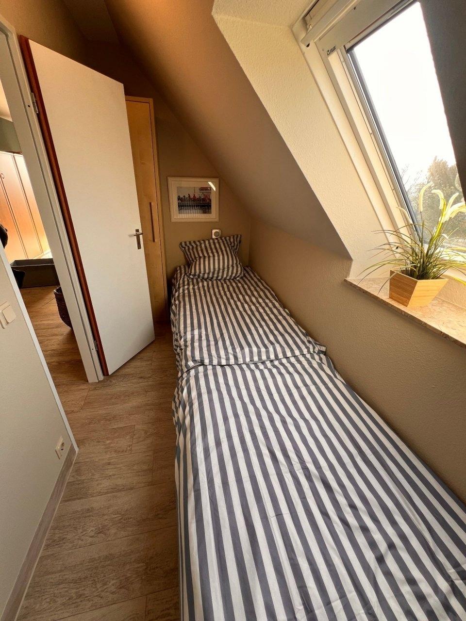 2-Zimmer Appartement im Haus "Nige Wark". In der TV-/Leseecke im Wohnzimmer befindet sich ein gemütliches Zweisitzer-Sofa, zwei Sessel und ein Flat- TV. Die integrierte Küchenzeile mit Spülmaschine, Mikrowelle und Kühlschrank mit Gefrierfach ist komplett ausgestattet und der ausziehbare Esstisch bietet genügend Platz für alle. Im Wohn-/Schlafraum befindet sich zusätzlich noch ein ein Schrankbett (2x90x200). Im Schlaf-/Kinderzimmer stehen zwei Einzelbetten (90x200). Das Badezimmer ist mit einer Dusche und WC ausgestattet. Die ca. 41 qm große Wohnung liegt im 2. OG und verfügt zudem auch über einen Balkon zum Garten