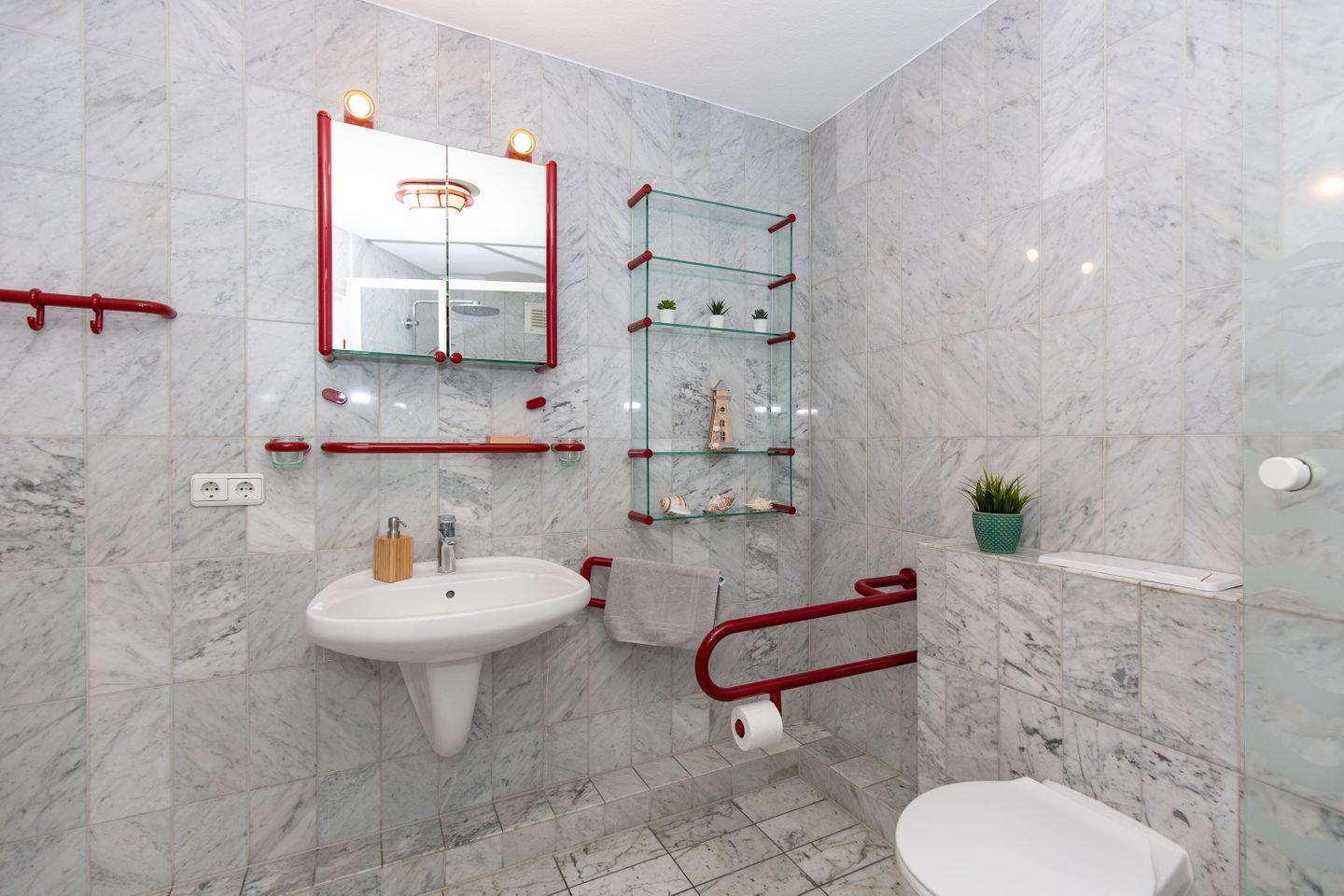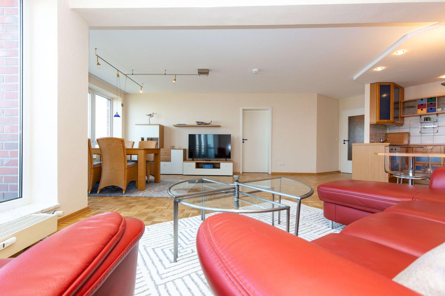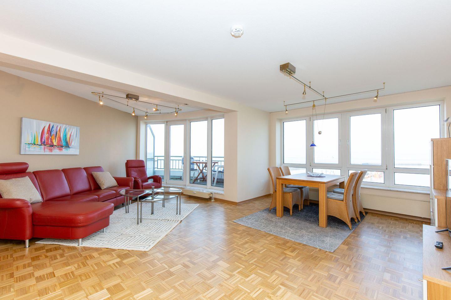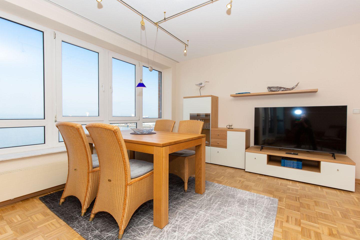 Haus "Seeterrassen", Typ B, Whg Nr. 35, bis 2 Personen, 3. Etage, ca. 76 qm Größe, direkte Seesicht auf den Weltschifffahrtsweg, Wohnbereich, sep. Schlafzimmer mit Doppelbett, Dusche/WC, offene Küchenzeile mit Geschirrspüler, Backofen, Kabel-TV, WLAN mit eigenem Router, Balkon, Stellplatz in der Tiefgarage, Haustiere sind nicht erlaubt, Nichtraucherwohnung