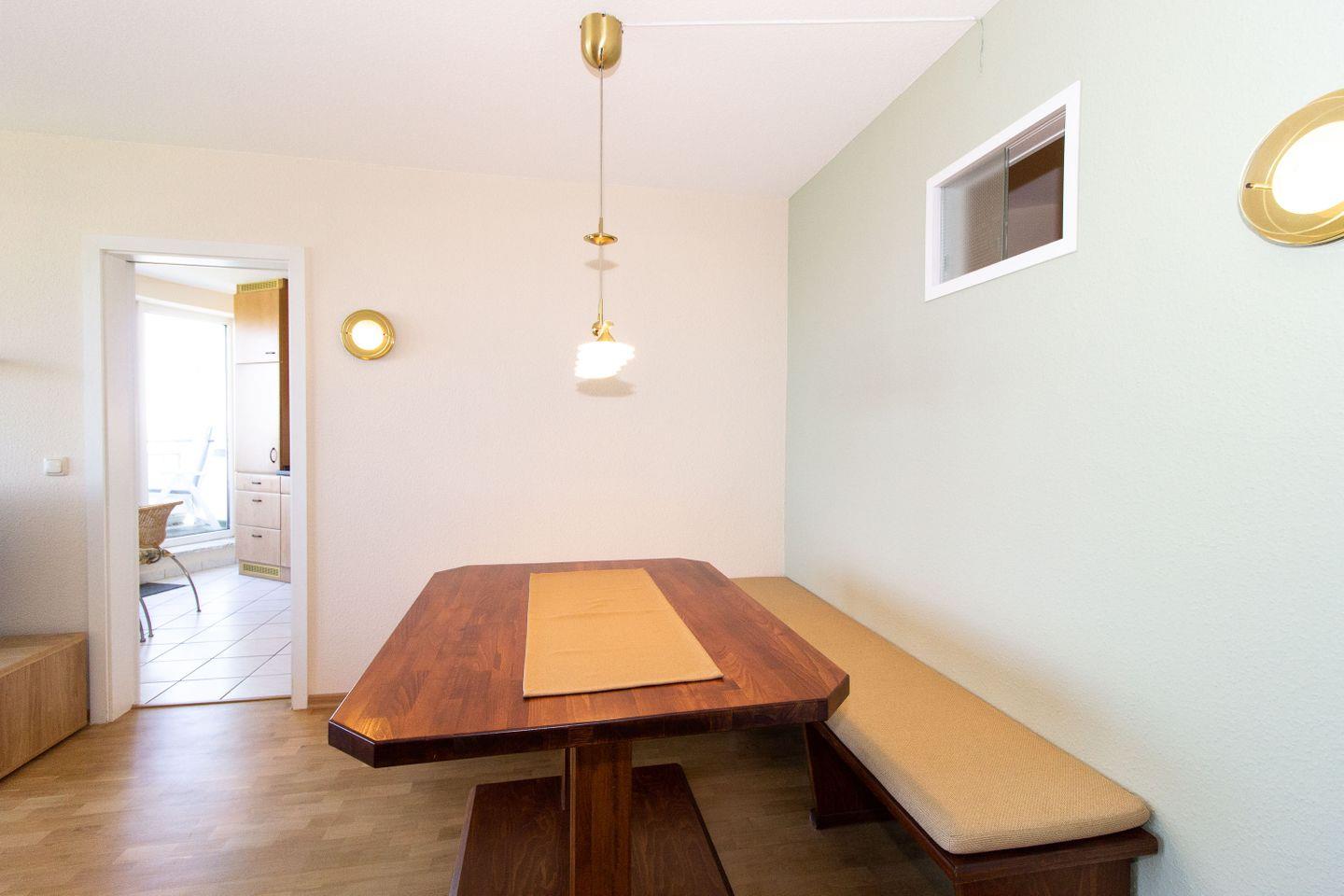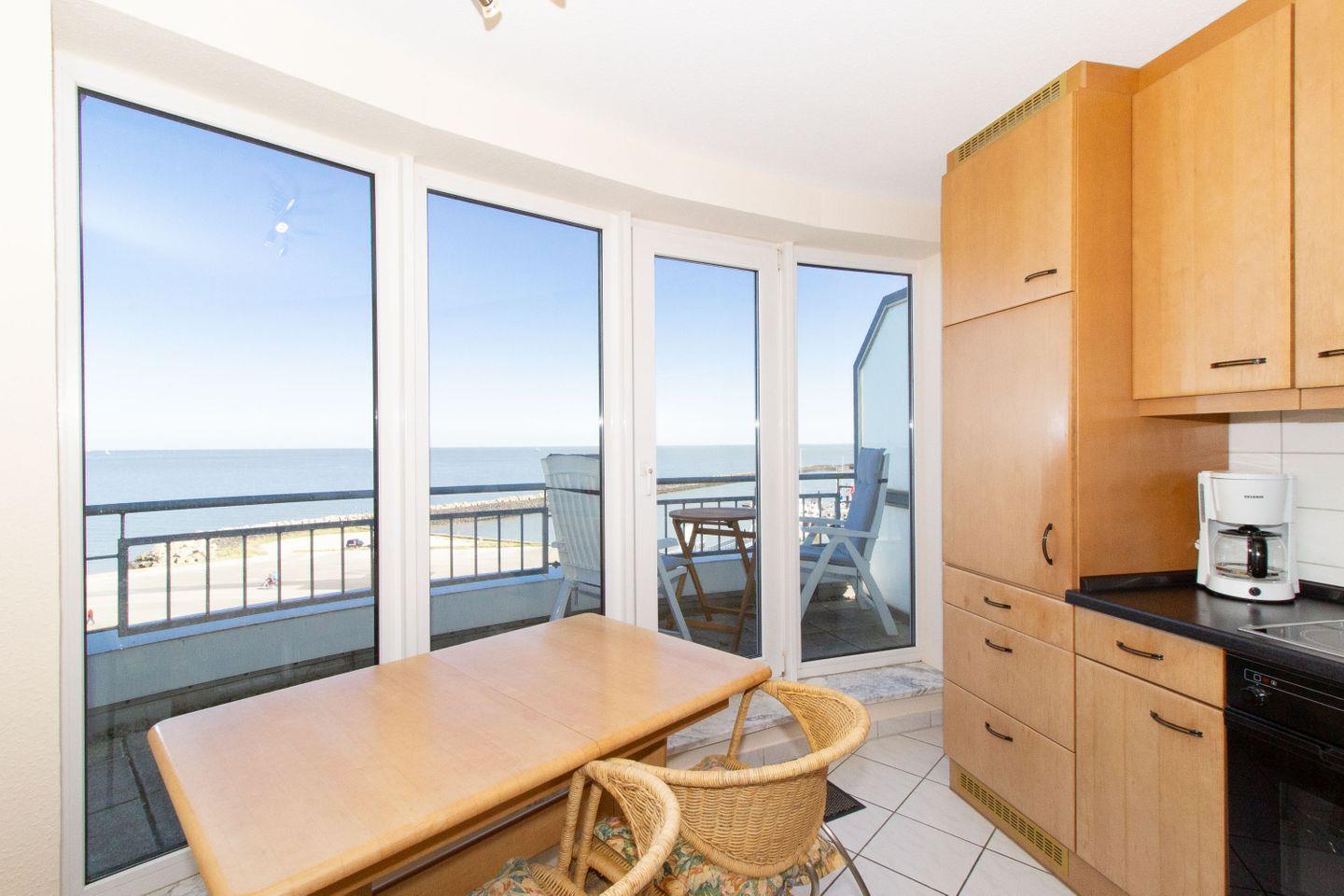 Über die Küche gelangt man auf den großzügigen Balkon, der mit bequemen Balkonmöbeln bestückt ist. Bei einem Frühstück unter freiem Himmel und mit fabelhaftem Ausblick auf den Weltschifffahrtsweg starten unsere Gäste perfekt in den Urlaubstag.