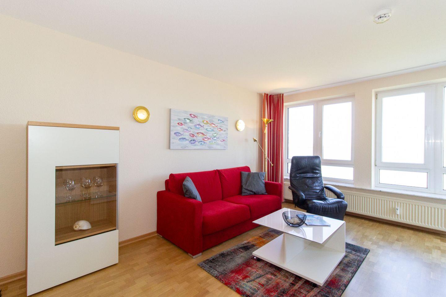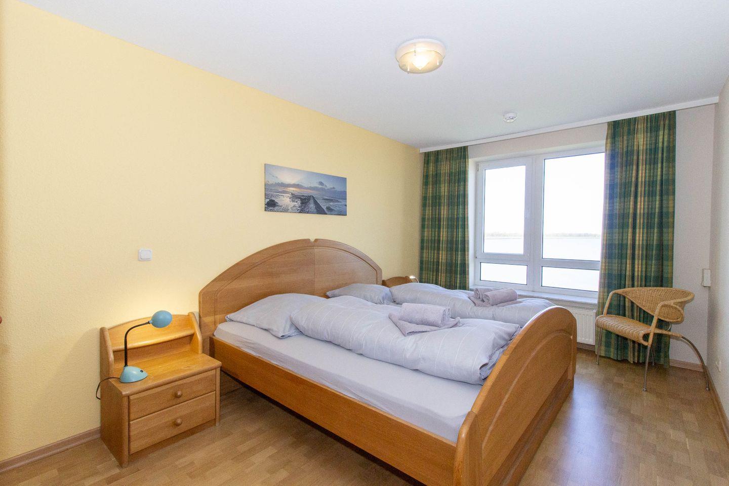 Haus "Seeterrassen", Typ B, Whg. Nr. 34, Eingang 38, bis 3 Personen, 3. Etage, ca. 76 m², direkte Seesicht auf den Weltschifffahrtsweg, Wohnbereich, erstes Schlafzimmer mit Doppelbett, zweites innenliegendes Schlafzimmer mit Einzelbett, Dusche/WC, sep. Küche mit Geschirrspüler, 4-Platten-Ceranfeld und Backofen, Kabel-TV, WLAN mit eigenem Router, Balkon, eigener Außenstellplatz, Haustiere sind nicht erlaubt, Nichtraucherwohnung.