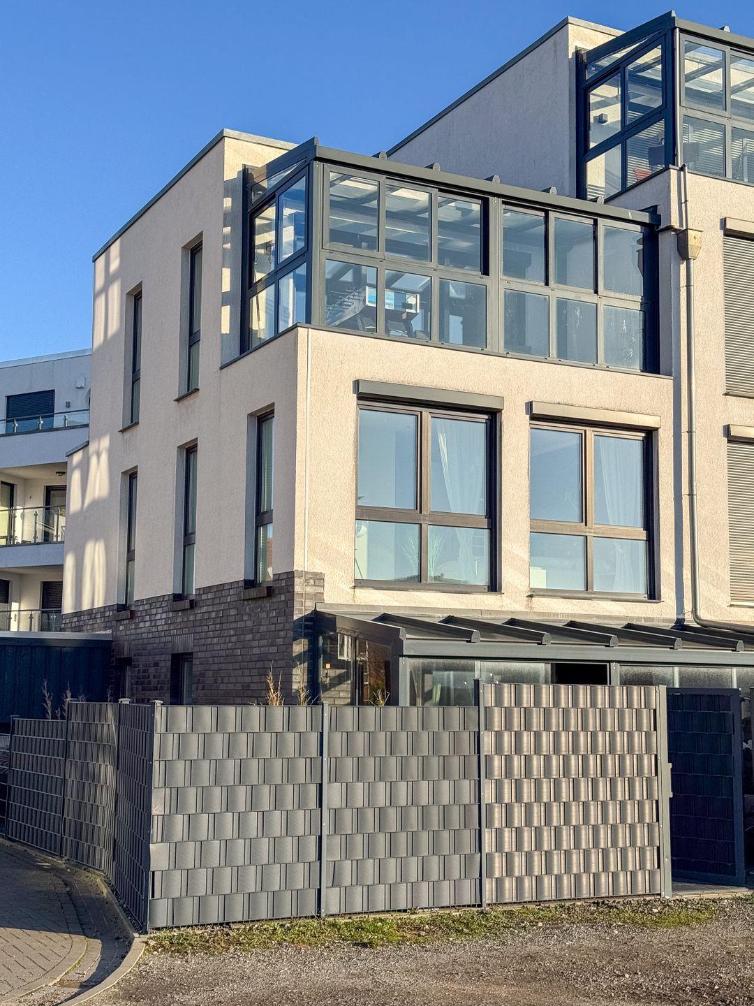 Ein besonderes Highlight ist der lichtdurchflutete Wintergarten, der das Haus zu jeder Jahreszeit mit natürlichem Licht versorgt und einen geschützten Rückzugsort bietet– ob beim Frühstück oder bei entspannten Abenden im Sonnenuntergang. Die angrenzende Terrasse läd zum Verweilen im Freien ein, wobei der Sichtschutz für die notwendige Privatsphäre sorgt.