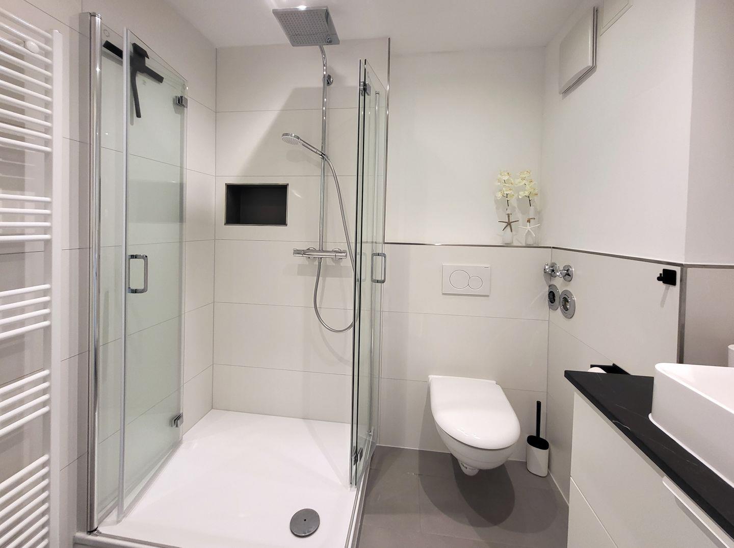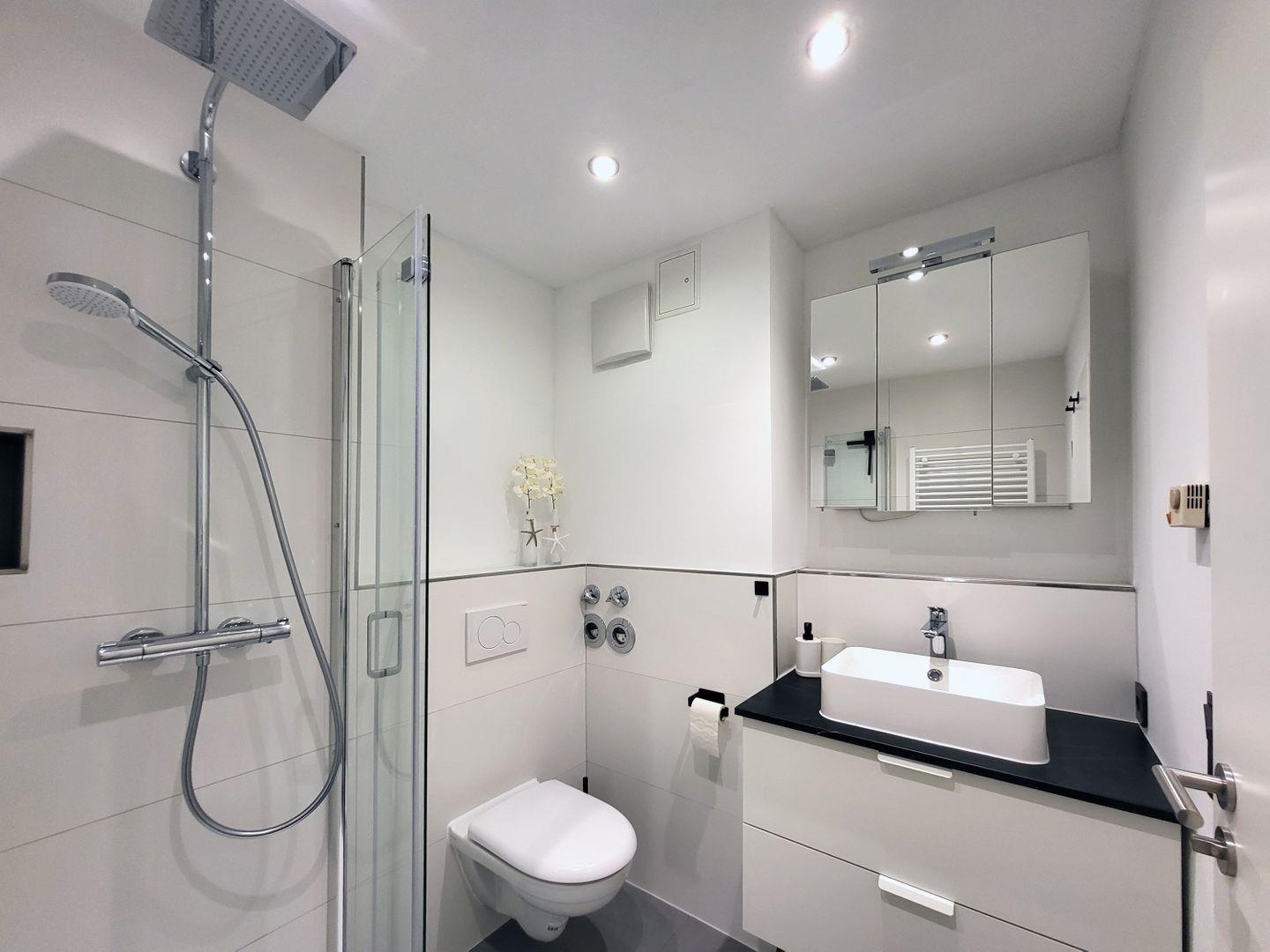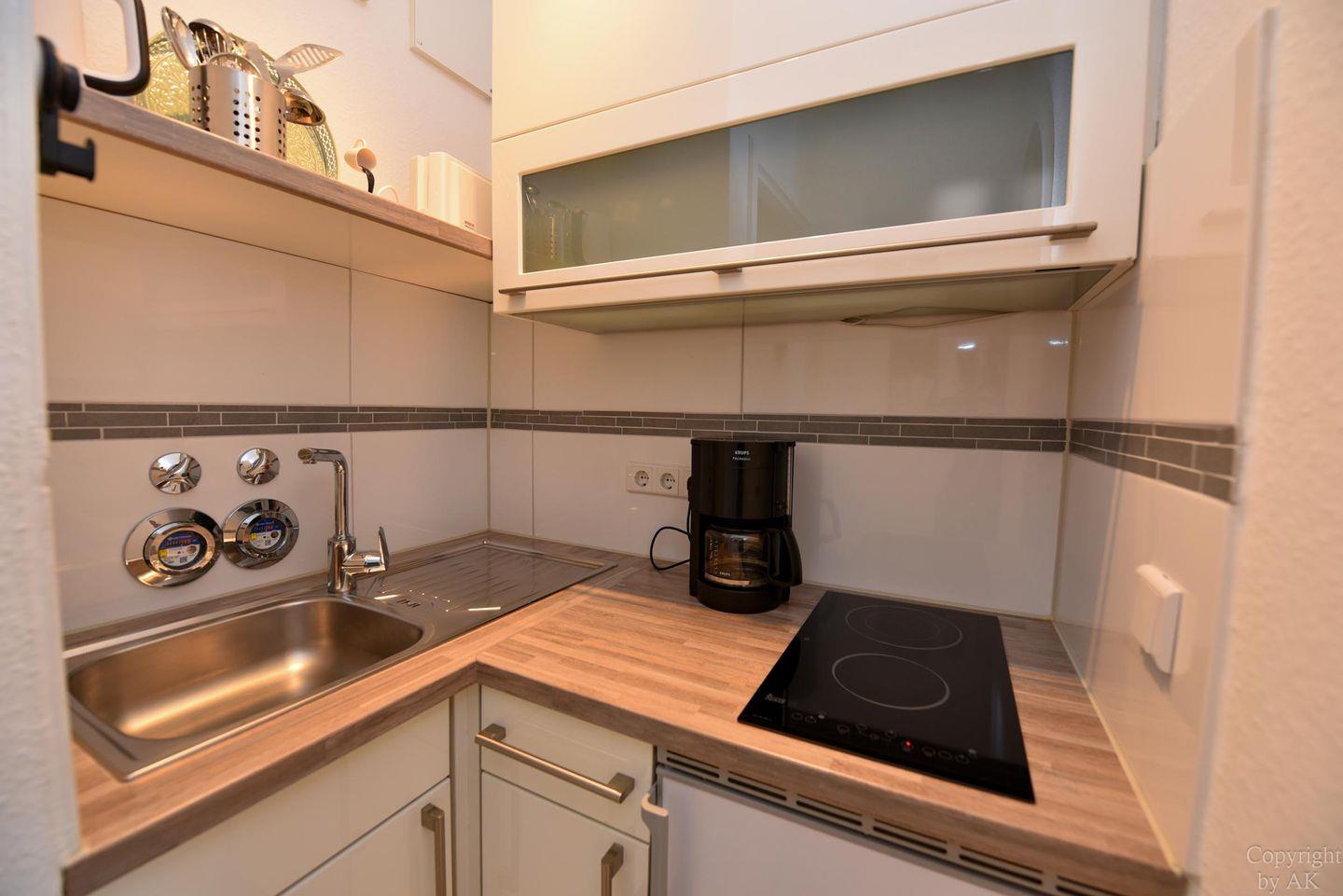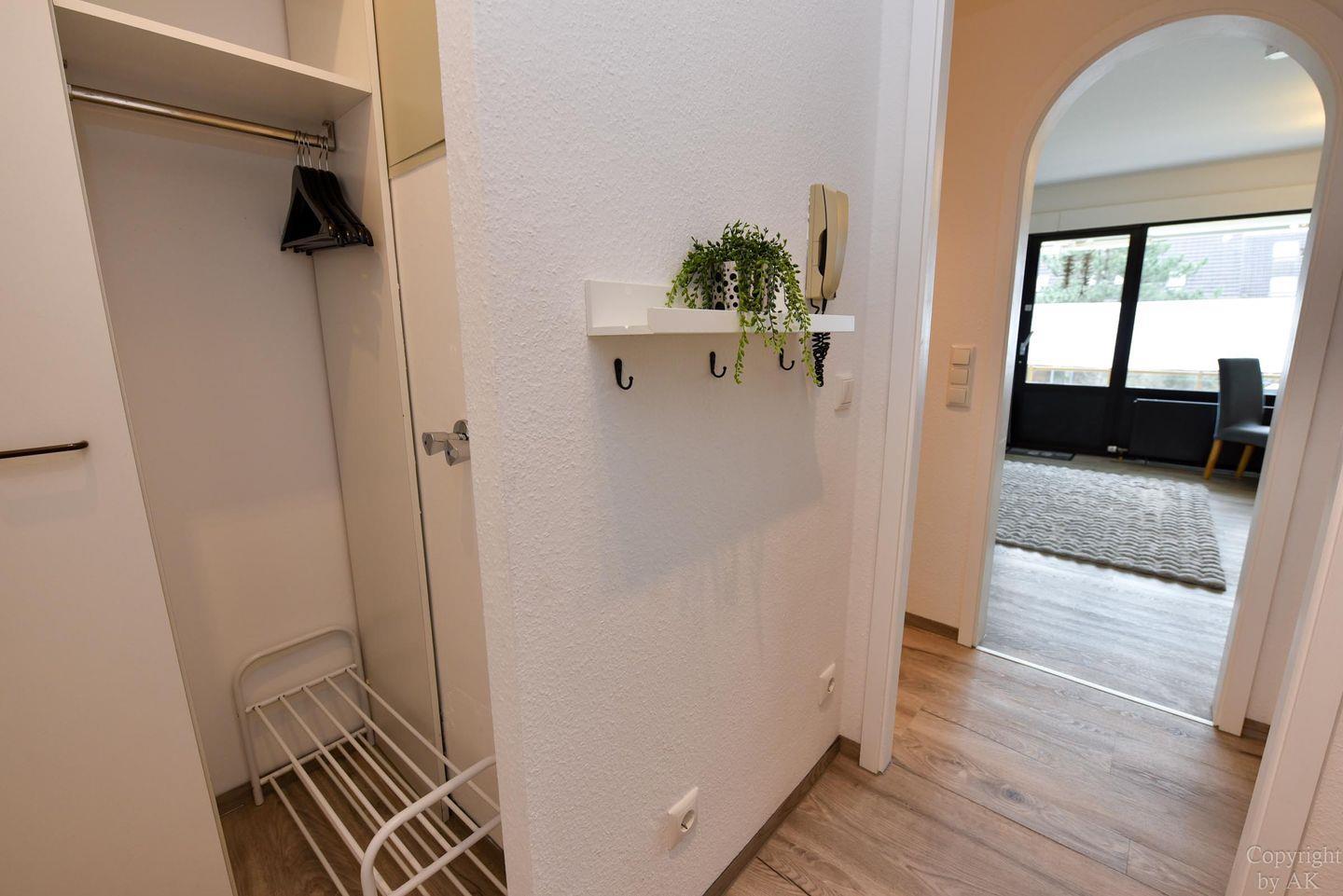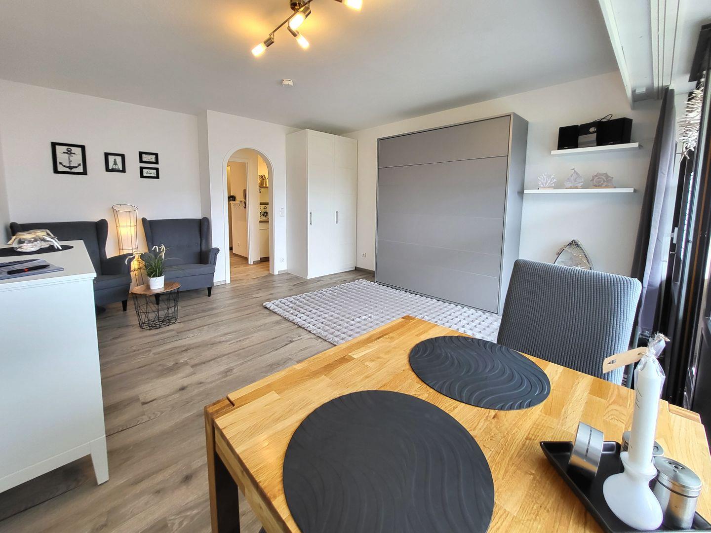 Gemütliches 1-Zimmer Appartement (34m2) für 2 Personen im 1. OG mit schönem Südbalkon mit Strandkorb. Der Wohn-/ Schlafraum ist u.a. mit einem Doppelschrankbett mit einer 160cmx200cm Matratzen ausgestatte sowie zwei gemütlichen Ohrensesseln die zum Verweilen einladen. Auf dem großen TV können Sie die gängigen Kabelkanäle empfangen.. Das Appartement ist mit einer Küchennische ausgestattet. Zudem gibt es einen Eßtisch mit 2 Stühlen. Das WC/Duschbad verfügt über eine Regendusche. Zu der Wohnung gehört auch ein Tiefgaragenplatz mit einer Einstellhöhe von 190 cm.