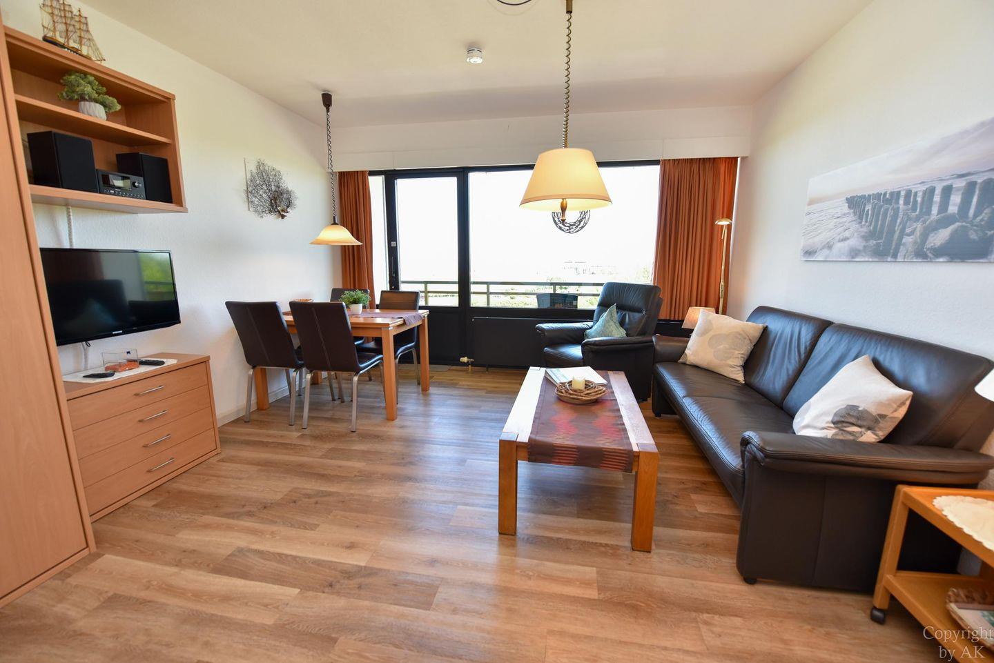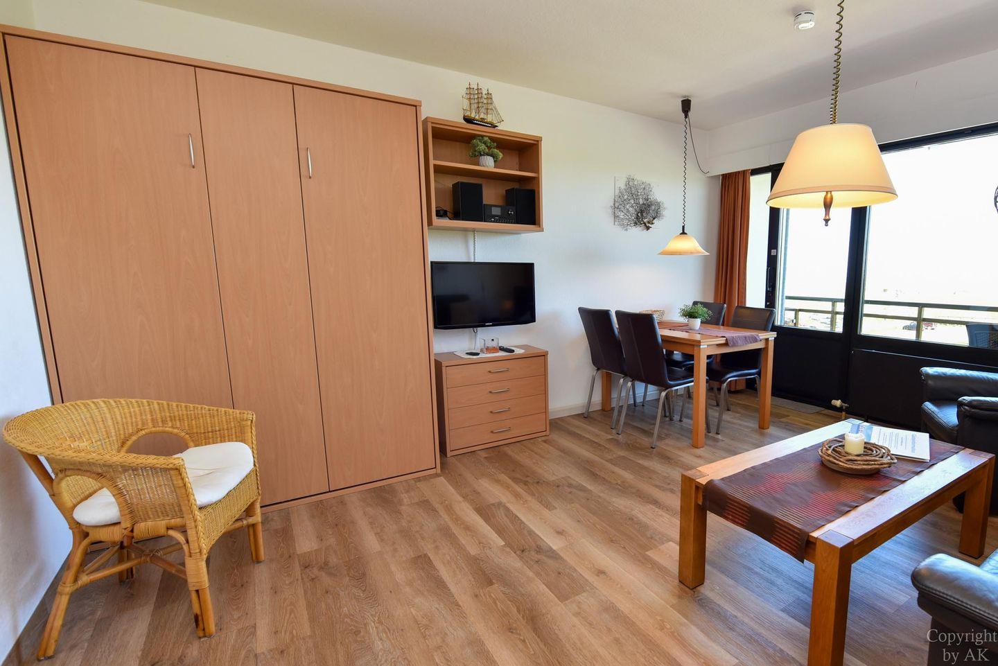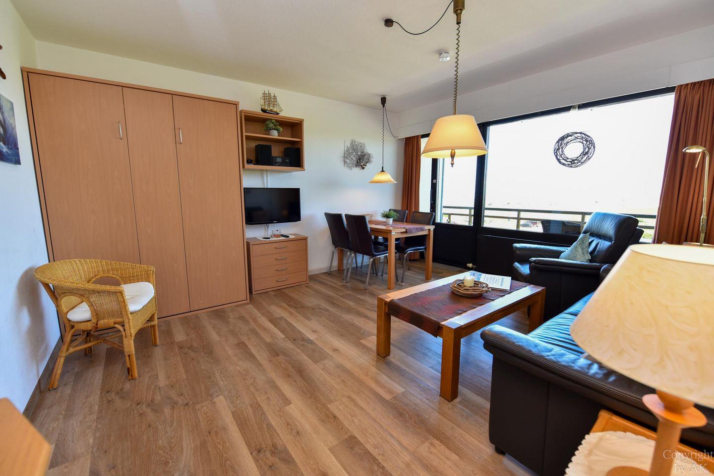 Schönes 2 Zimmer-Appartement mit toller Seesicht und großem Balkon im 3 OG, zu welchem auch ein eigener Strandkorb (01.05.-30.09) am Sandstrand gehört. In dem gemütlichem und mit Vinylboden ausgestattetem Appartement befindet sich im Wohn- und Essbereich u.a. ein Schrankbett (1,40x2,00m). In dem mit dem Wohnzimmer verbundenen und durch einen Vorhang getrennten Schlafraum finden Sie ein Ehebett. Vervollständigt wird dieses Appartement durch das WC/Duschbad (walk-in). Der kostenlose Tiefgaragenstellplatz hat eine Einstellhöhe von 195 cm. Zu der Wohnung gehört auch ein Dauerparkschein für die Nordfeldstraße und dem großen öffentlichen Parkplatz dem Haus gegenüber.