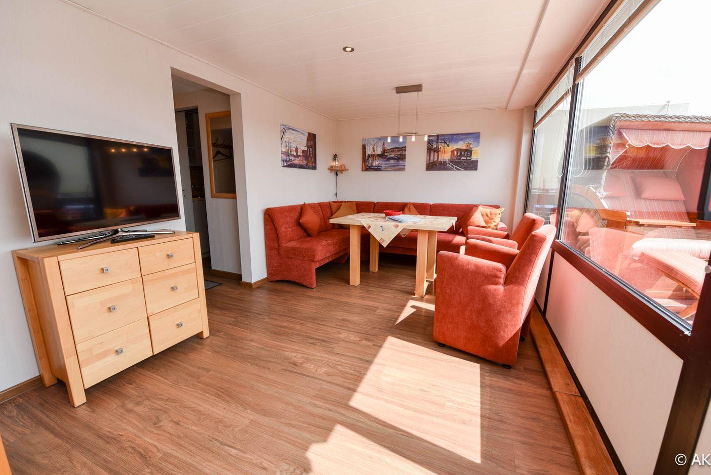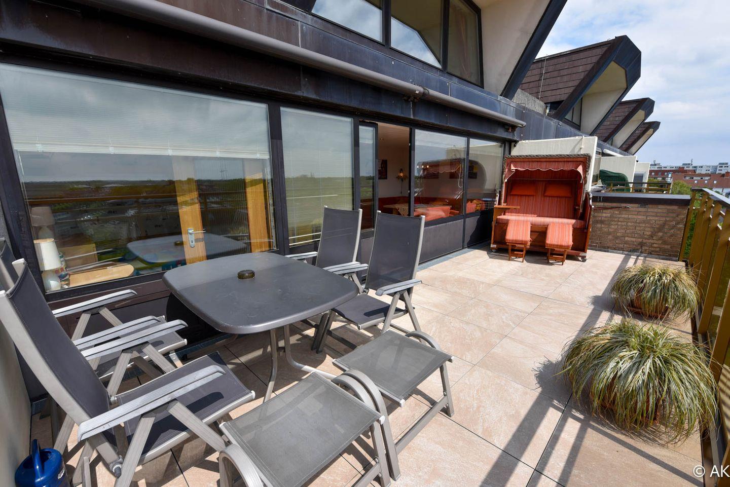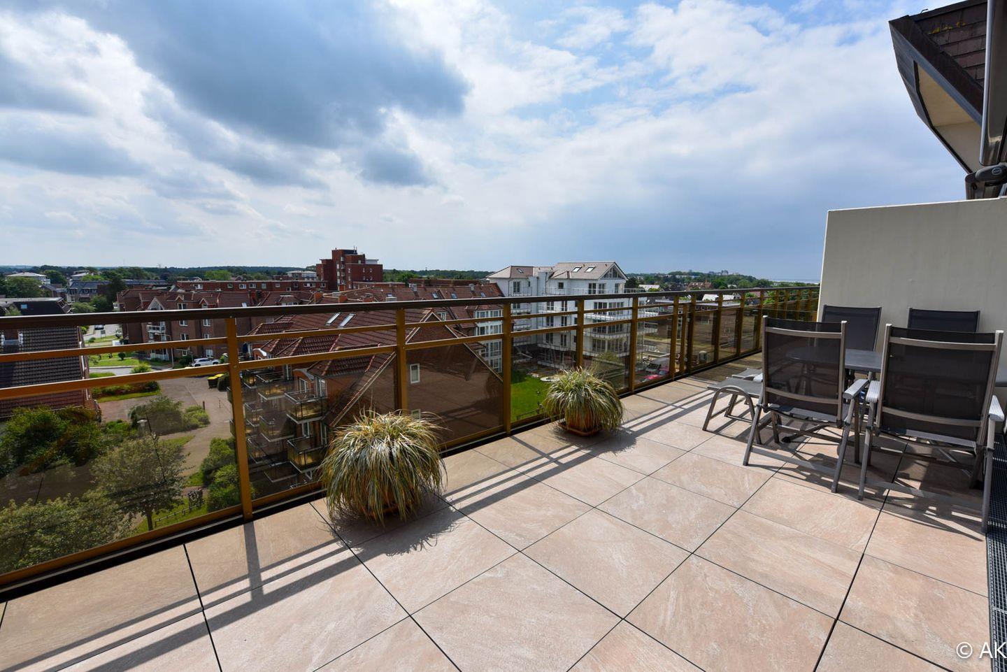 3-Zimmer Maisonette-Appartement im 5 OG zur Sonnenseite. Dieses schöne Appartement bietet Ihnen eine mit einem gemütlichem Sofa ausgestattete Essecke mit Tisch und einen Sessel, sowie Kabel TV und eine Hifi-Anlage mit integriertem DVD. Die separate Komfortküche ist u.a. mit einem Geschirrspüler, einer Back-Mikrowelle und einem großem Kühlschrank ausgestattet . Das Kinderzimmer hat ein Etagenbett und der Elternschlafraum ein Ehebett sowie gemütliche Sesseln. Im Bad/WC sind zwei Waschbecken und eine Dusche sowie eine Badewanne vorhanden. Die große Dachterrasse, welche u.a. mit einem traditionellen Strandkorb ausgestattet ist bietet einen wundervollen Panoramablick über Cuxhaven. Der dazugehörige PKW Tiefgaragenstellplatz hat eine Einstellhöhe von bis 149 cm. Fahrstuhl bis zur 5. Etage.