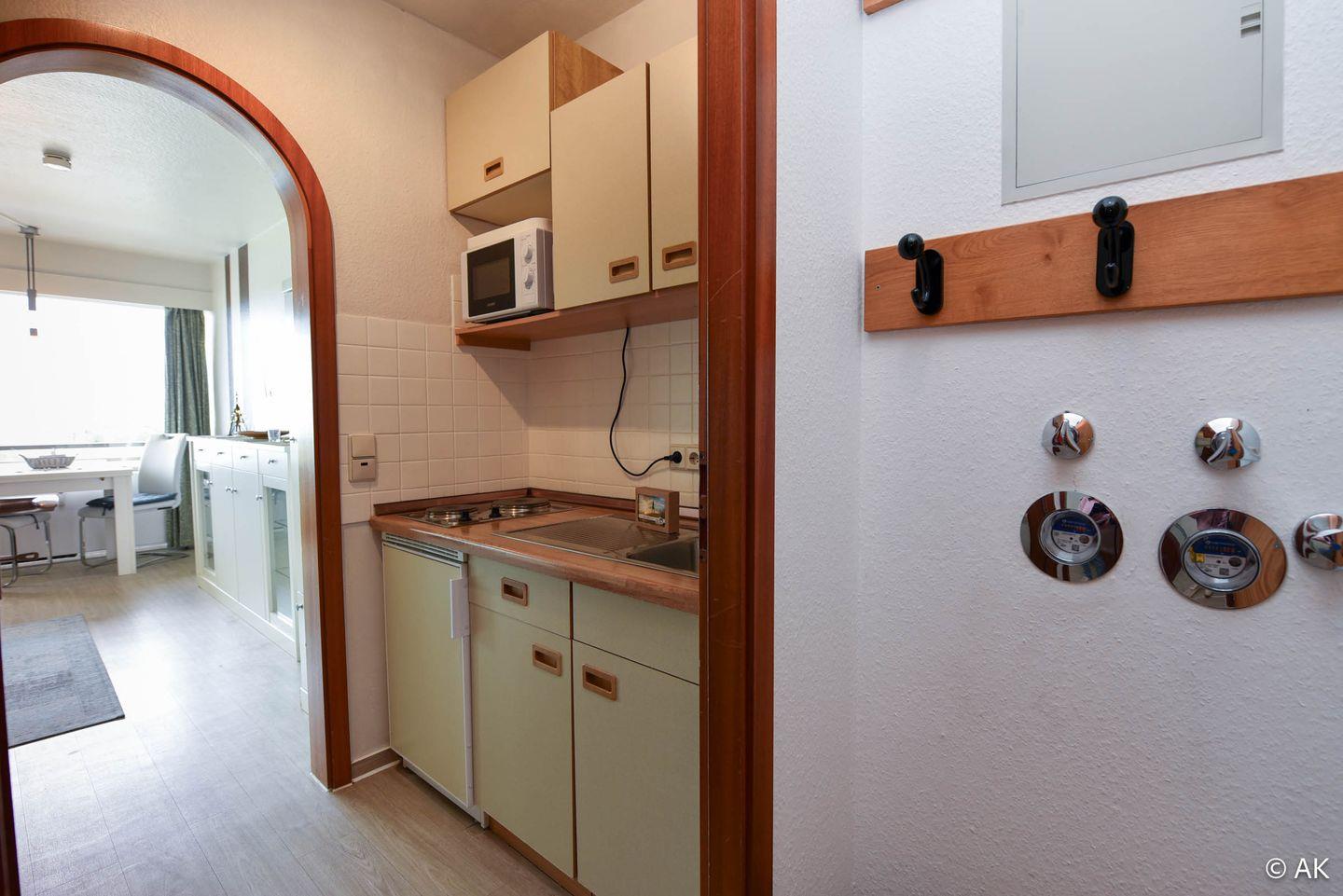 Im Wohnbereich befinden sich zwei einzelne Klappbetten, ein Sofa sowie ein Esstisch mit Stühlen, von dem aus Sie einen schönen Ausblick genießen können. Die kleine Küchennische ist mit einem 2-Platten-Herd und einer Mikrowelle ausgestattet, sodass Sie problemlos kleine Mahlzeiten zubereiten können. Abgerundet wird die Wohnung durch ein Duschbad. Ein kostenloser Internetzugang sowie ein Tiefgaragenstellplatz (maximale Einfahrtshöhe 149 cm) stehen Ihnen ebenfalls zur Verfügung.