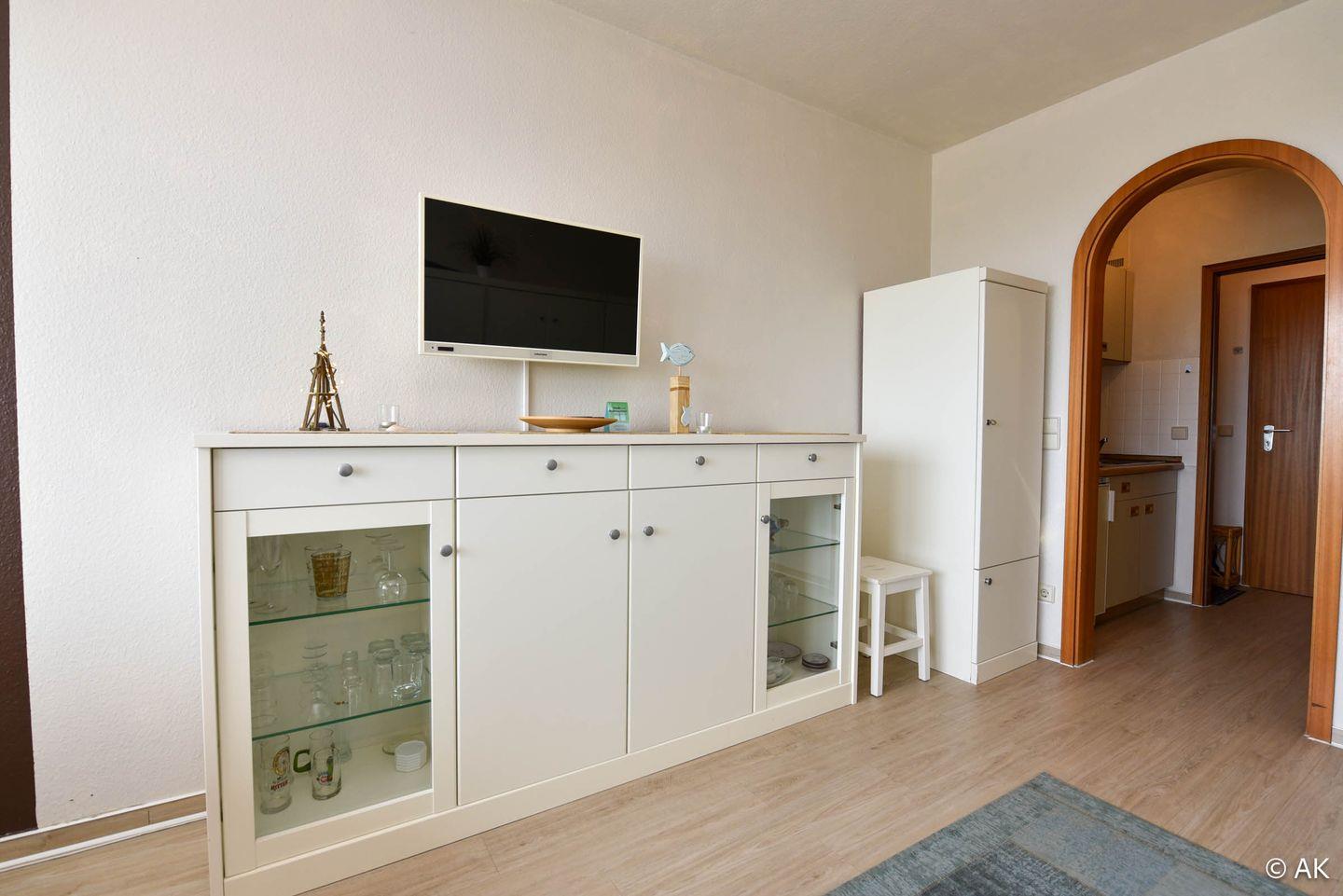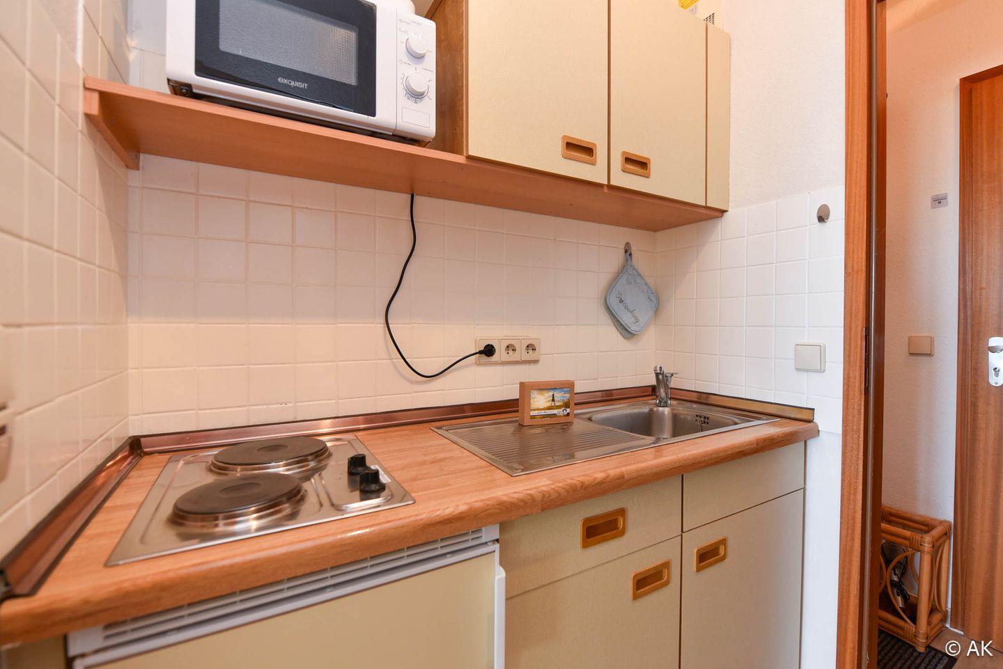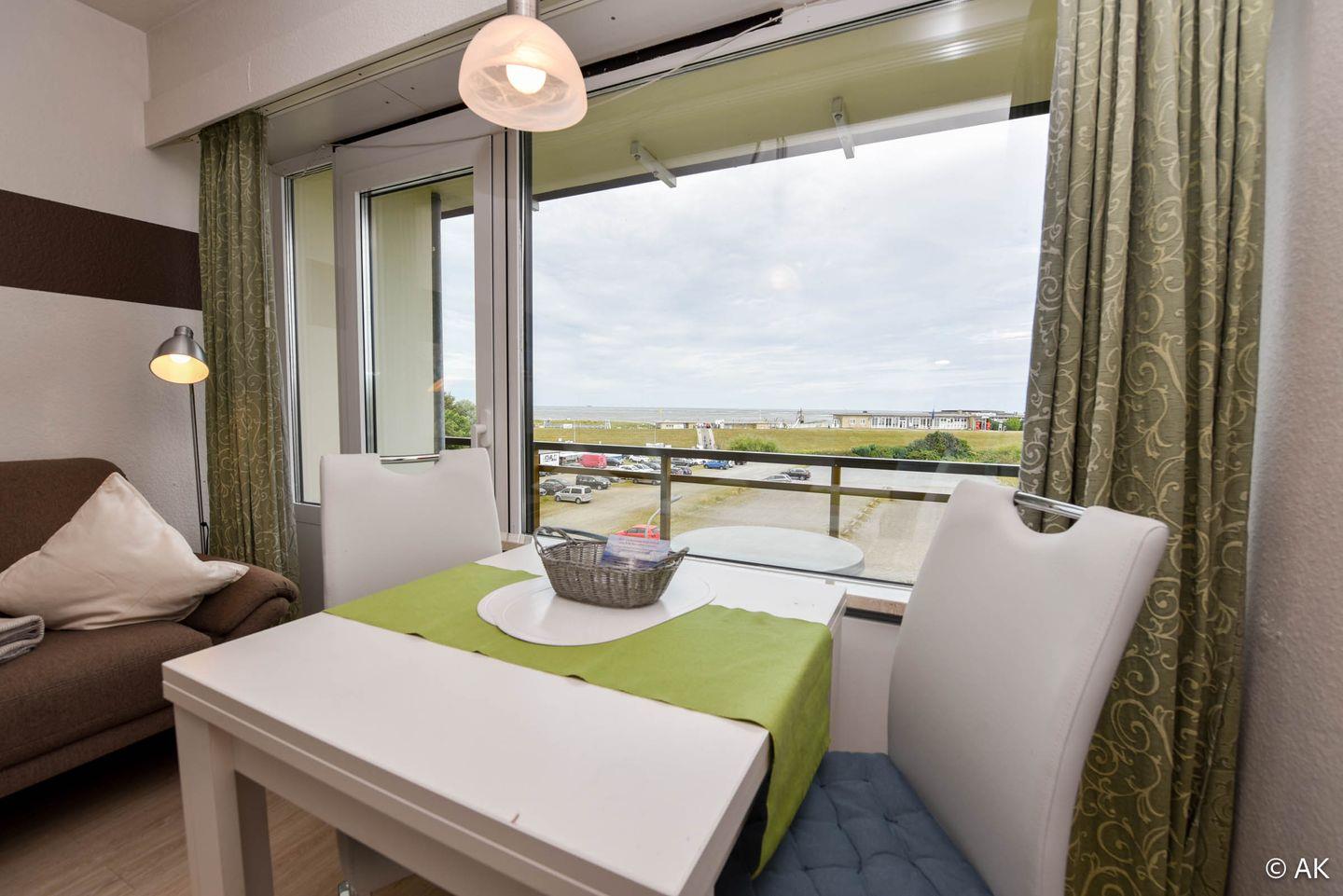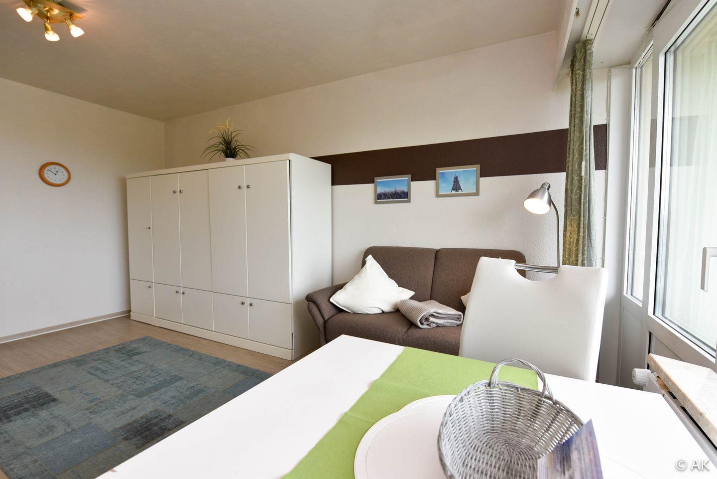 Komfortables 1-Zimmer-Appartement für 2 Personen im 3. Obergeschoss mit Seesicht und eigenem Strandkorb am Strand (01.05.–30.09.).