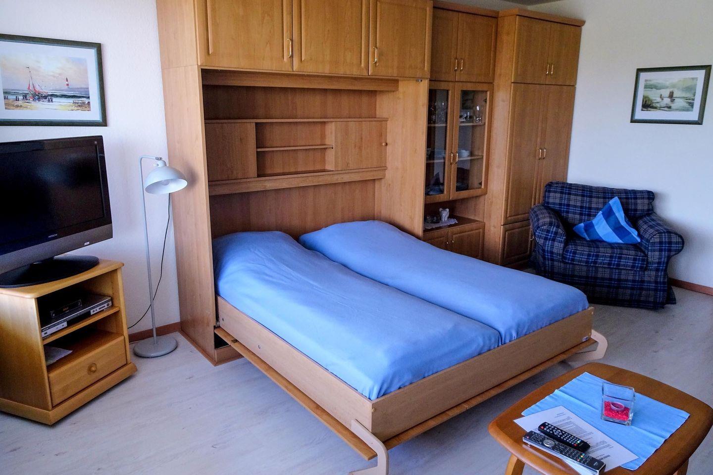 Das geräumige 1-Zimmer Appartement für 2 Personen im 1 OG. im Haus "Jan am Strand" verfügt über einen großen Balkon zur Seeseite mit Blick auf den Deich und in Richtung des Weltschifffahrtsweg. Das Appartement mit Flach TV, Kabelfernsehen und DVD Player wurde mit Laminat und einer einladenden Sofagarnitur aufgewertet. Es bietet ein Doppelschrankbett mit einzelnen Matratzen und verfügt über eine separate Kochnische, einem großzügigen Essbereich mit Tisch und 4 Stühlen. Das Badezimmer ist geräumig mit einem Doppelwaschbecken und einem Wannenbad. Zu dem Appartement gehört auch ein Tiefgaragenplatz (Höhe 149 cm).