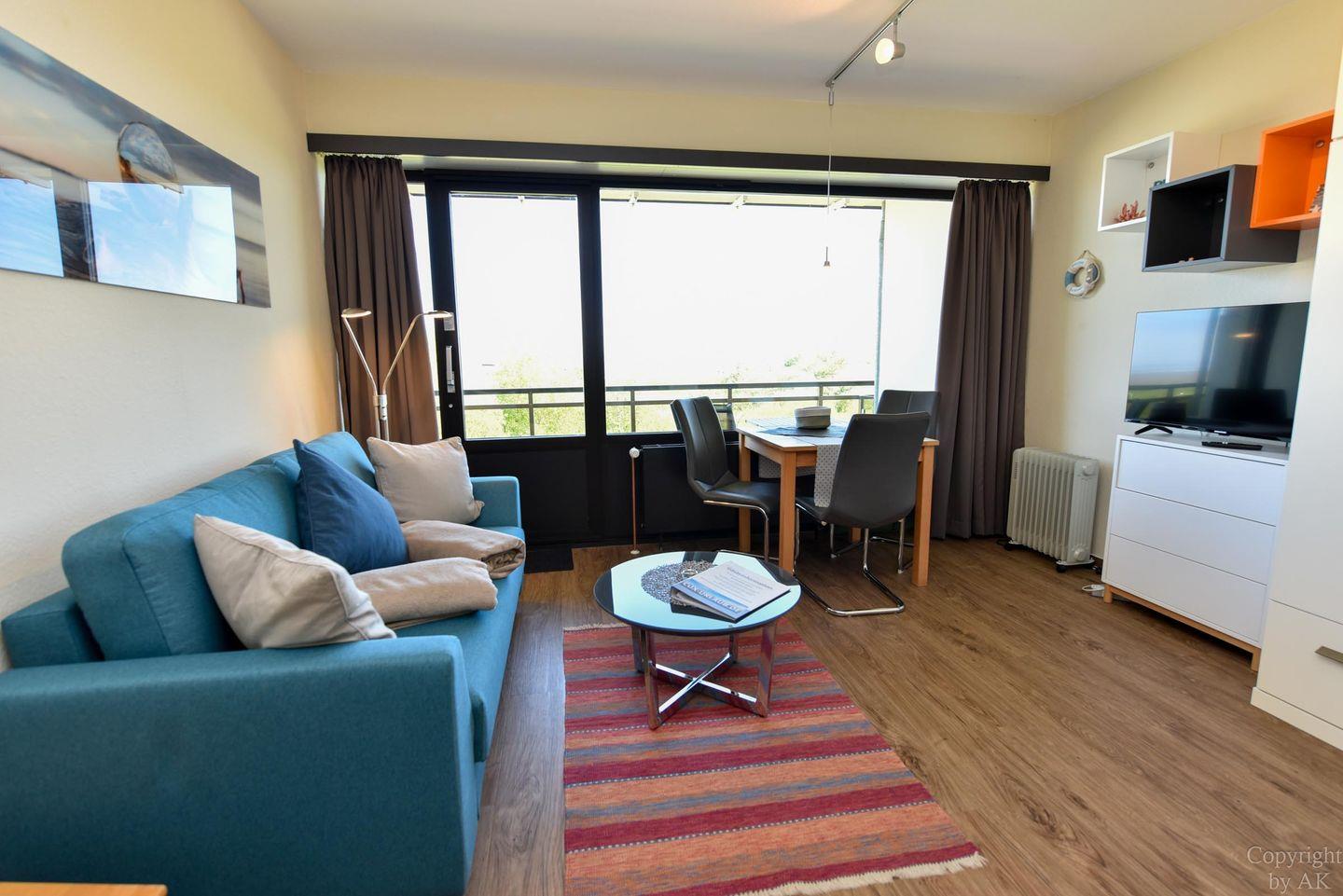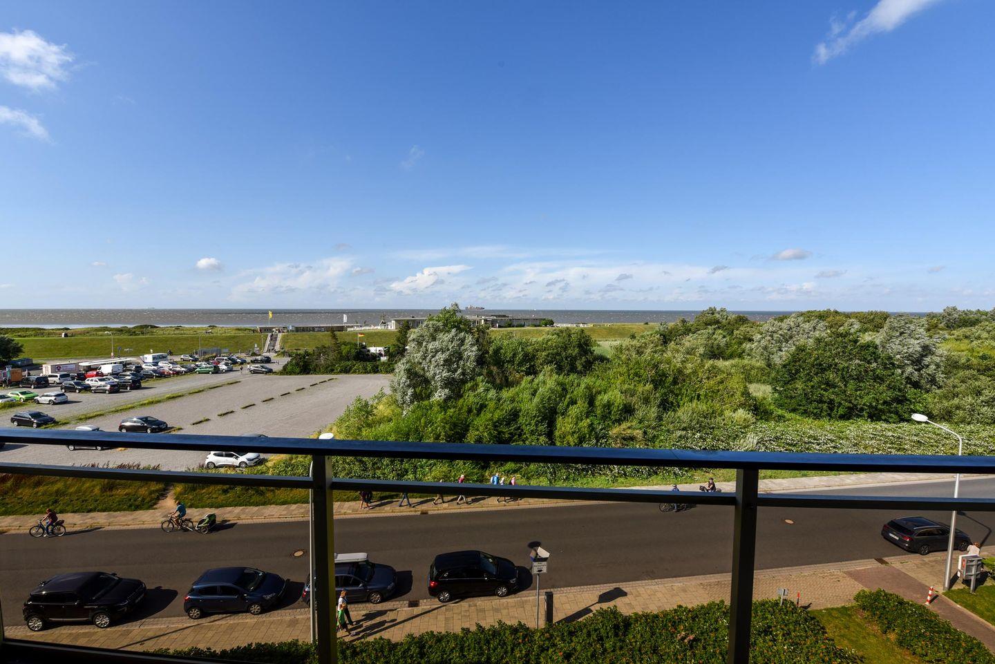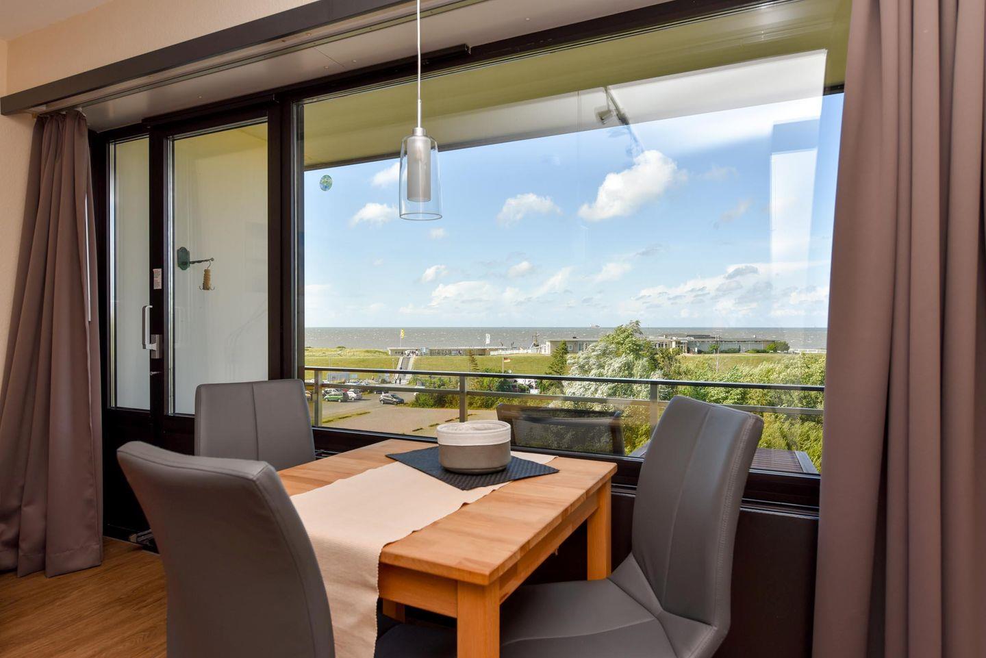 1-Zimmer Ferienappartement im 4. OG im Haus JAN AM STRAND mit großem Balkon und toller Seesicht auf den Weltschifffahrtsweg und das Weltnaturerbe Wattenmeer. Komfortable eingerichtetes Appartement für 2 Personen, mit moderner Küchennische. Im Wohnbereich befindet sich ein Schrankbett , ein Sofa sowie ein Tisch und 2 Stühle. Das Duschbad ist neu. Der Tiefgaragenstellplatz hat eine Einstellhöhe von 195cm.
