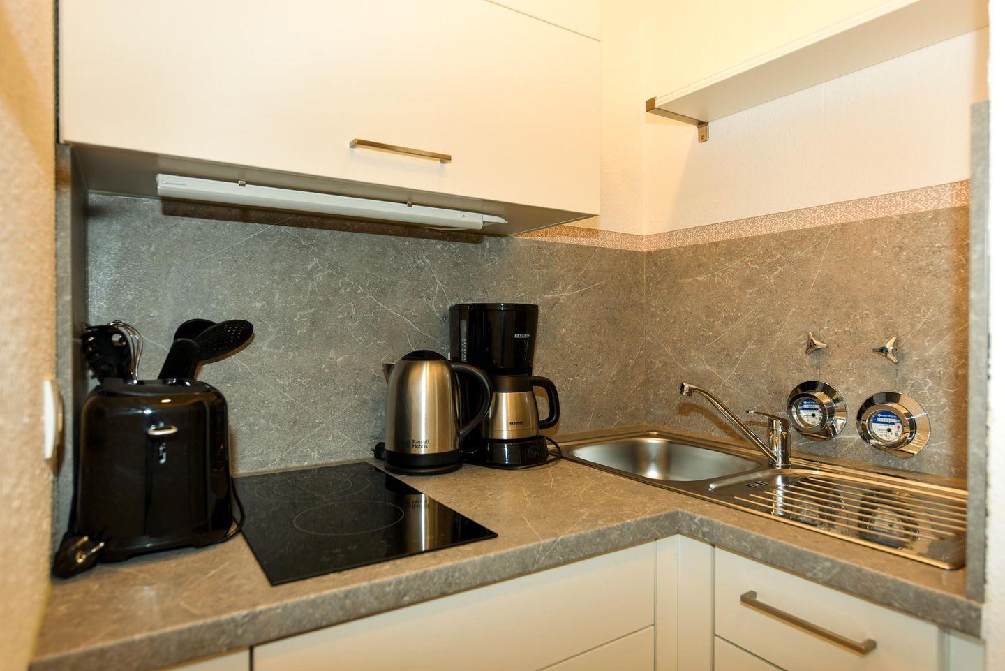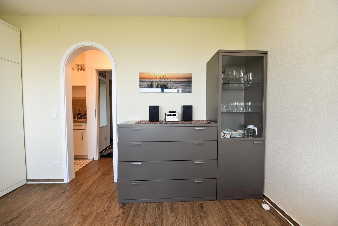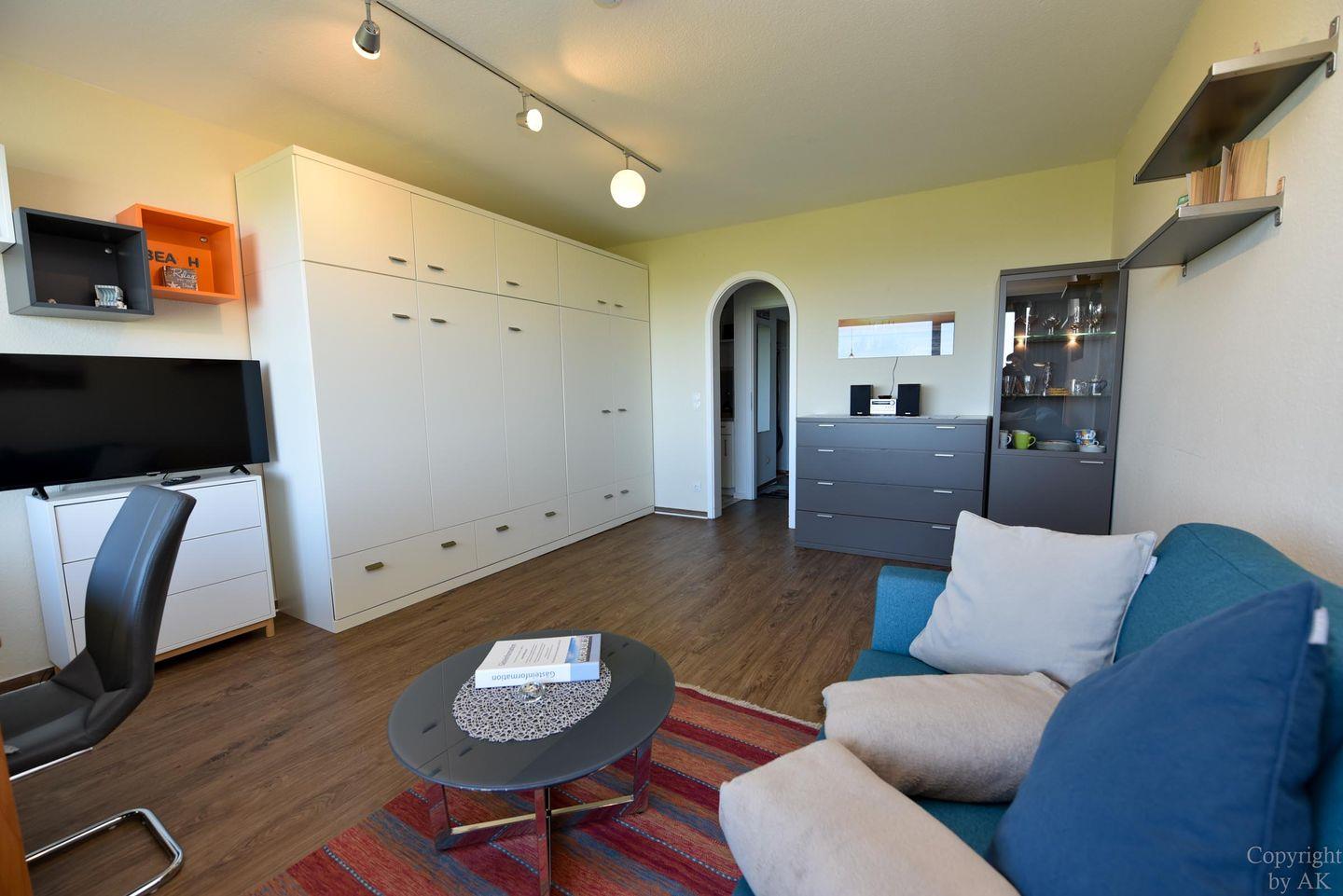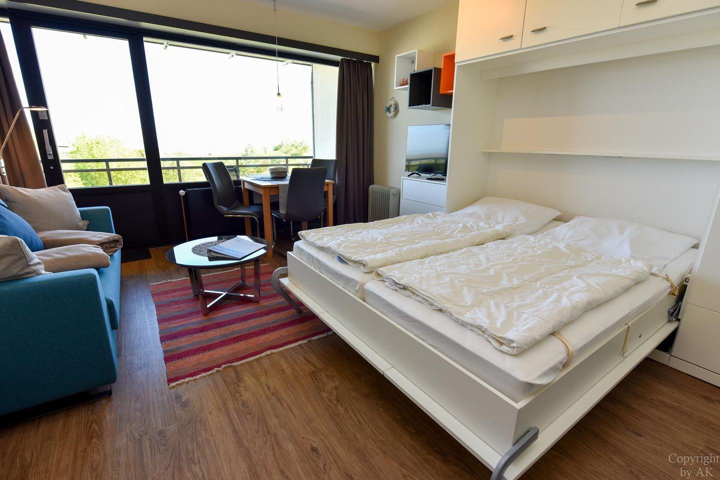 1-Zimmer Ferienappartement im 4. OG im Haus JAN AM STRAND mit großem Balkon und toller Seesicht auf den Weltschifffahrtsweg und das Weltnaturerbe Wattenmeer. Komfortable eingerichtetes Appartement für 2 Personen, mit moderner Küchennische. Im Wohnbereich befindet sich ein Schrankbett , ein Sofa sowie ein Tisch und 2 Stühle. Das Duschbad ist neu. Der Tiefgaragenstellplatz hat eine Einstellhöhe von 195cm.
