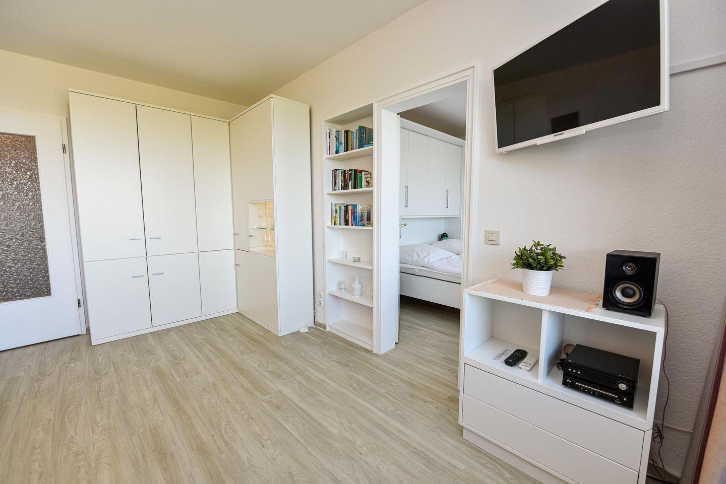 Im separaten Schlafzimmer sorgt ein komfortables Doppelbett für erholsame Nächte. Zur Unterhaltung stehen Ihnen Kabel-TV, eine Stereoanlage, ein DVD-CD-Player sowie kostenfreies WLAN zur Verfügung. Das moderne Badezimmer ist mit Dusche und WC ausgestattet. Für zusätzliche Bequemlichkeit verfügt die Wohnung über einen eigenen Tiefgaragenstellplatz, der eine maximale Einstellhöhe von 195 cm erlaubt.