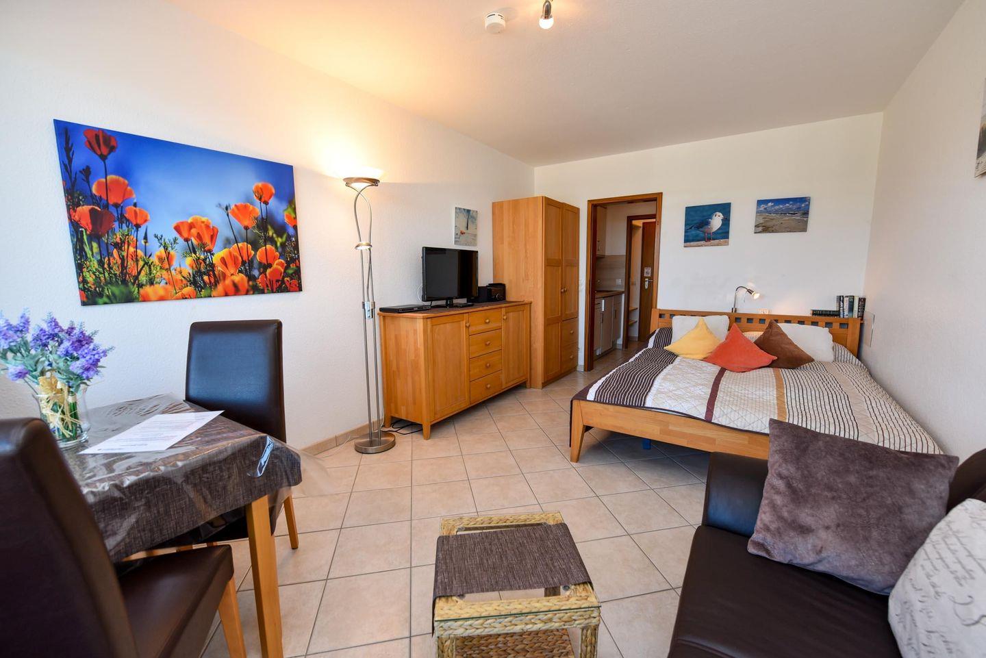 Dieses charmante 1-Zimmer-Ferienappartement im 2. Obergeschoss bietet Ihnen eine wunderbare Unterkunft mit Seesicht. Der offene Wohnbereich ist praktisch und komfortabel eingerichtet: Ein gemütliches Doppelbett lädt zum Entspannen ein, während der Esstisch ideal für gemeinsame Mahlzeiten ist.