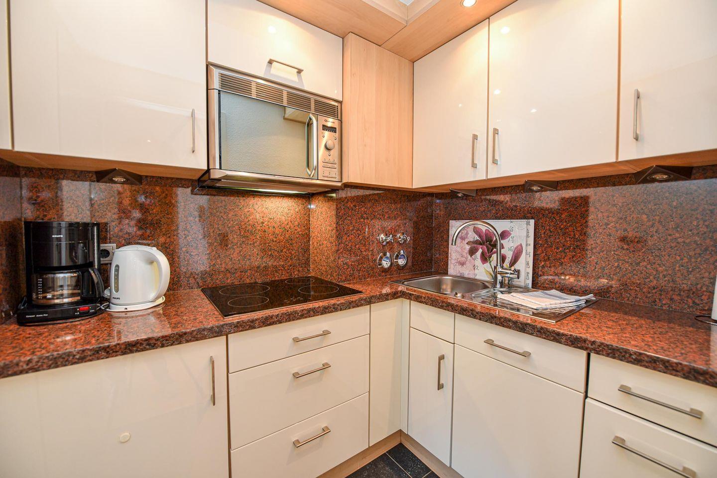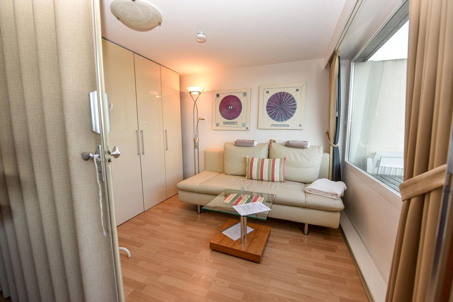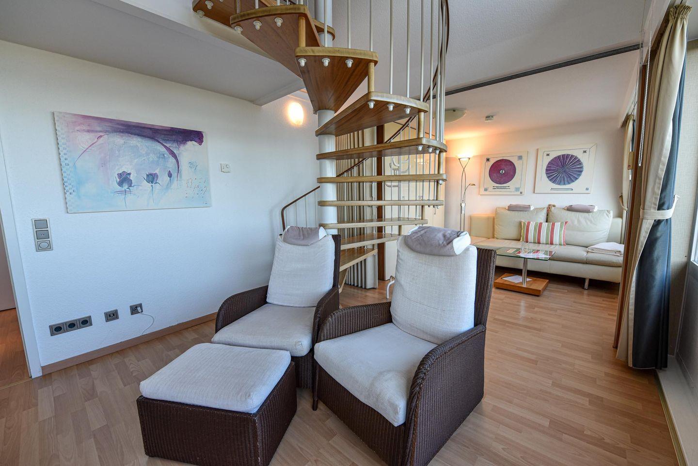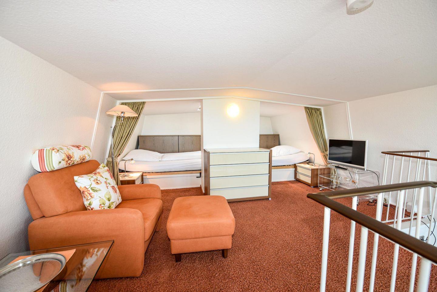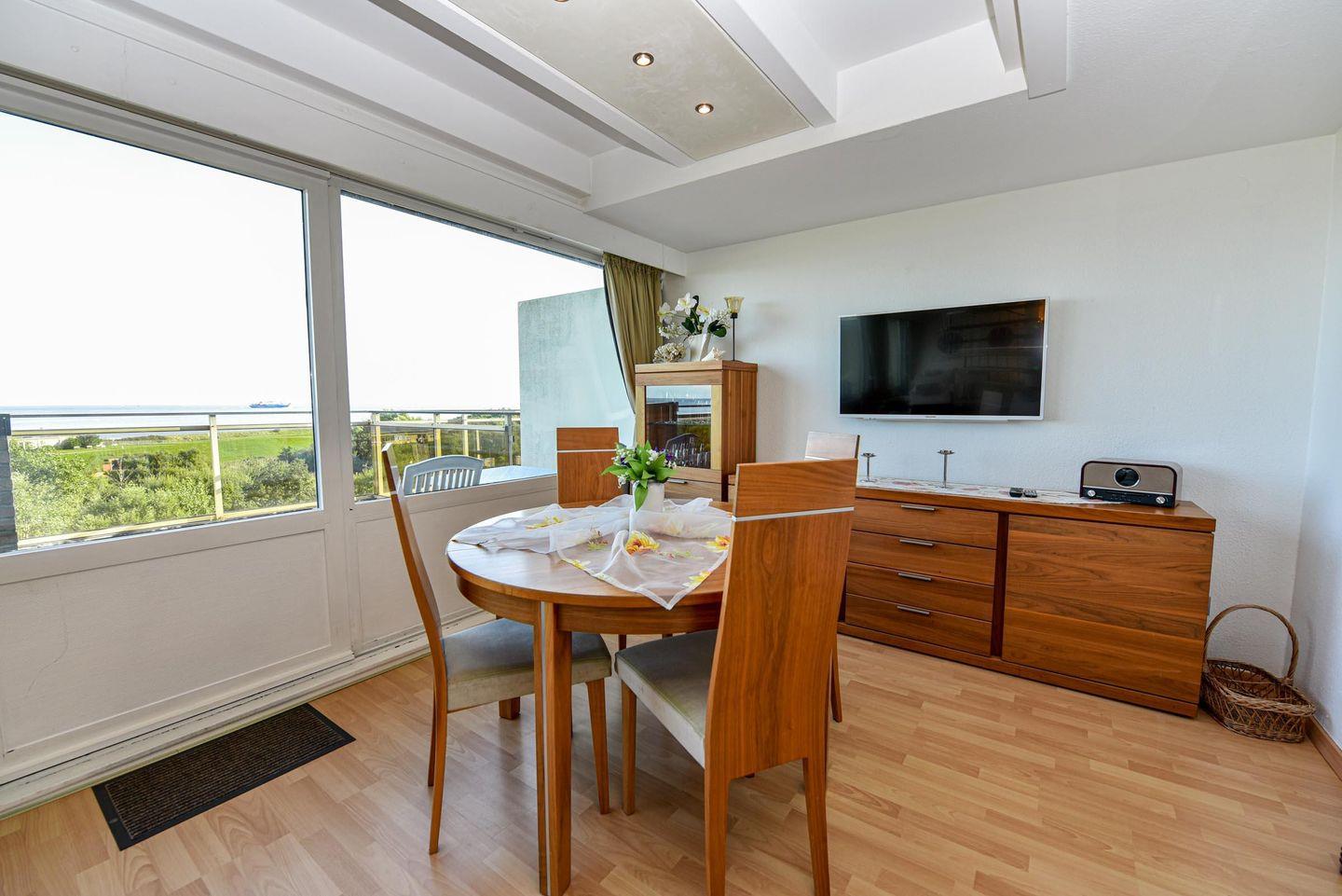 2 Zimmer Penthouse-Wohnung im 5. OG mit großer Dachterasse und Panorama-Seesicht. Vom Ess- und Wohnraum, sowie von der Empore, schauen Sie auf den Weltschifffahrtsweg und das UNESCO Weltnaturerbe Wattenmeer. Der Wohnraum, trennbar mit Schlafcouch, ist u.a. mit gemütlichen Sesseln uns einem Esstisch für 4 Personen ausgestattet. Es gibt eine komfortable Küchenzeile mit Mikrowelle und Kühlschrank*** . Auf der Schlafempore, welche Kopfhöhe 165 bis 175 cm hat, befinden sich zwei großzügige Betten (120cm x 200cm). Das helle Badezimmer verfügt über eine Badewanne und eine Dusche, sowie 2 Waschbecken. Der zu dieser Wohnung gehörende Tiefgaragenstellplatz hat eine Einstellhöhe 190cm