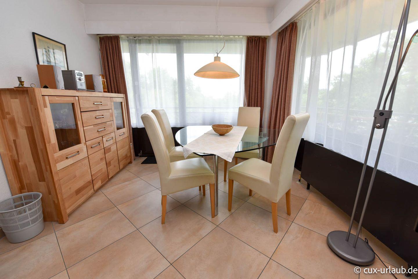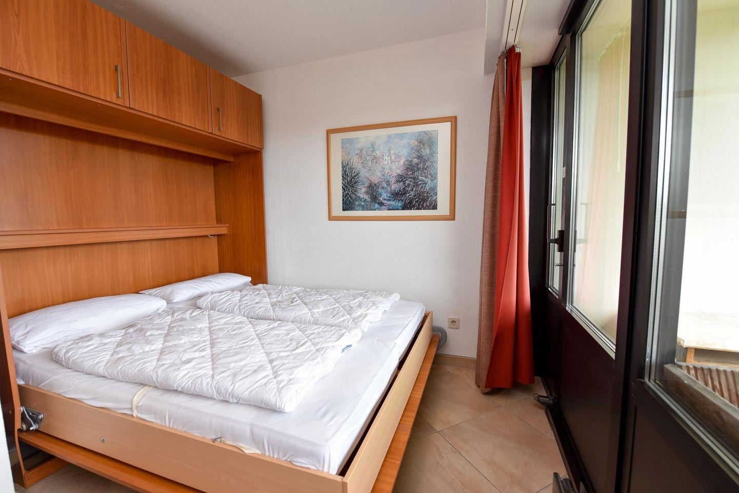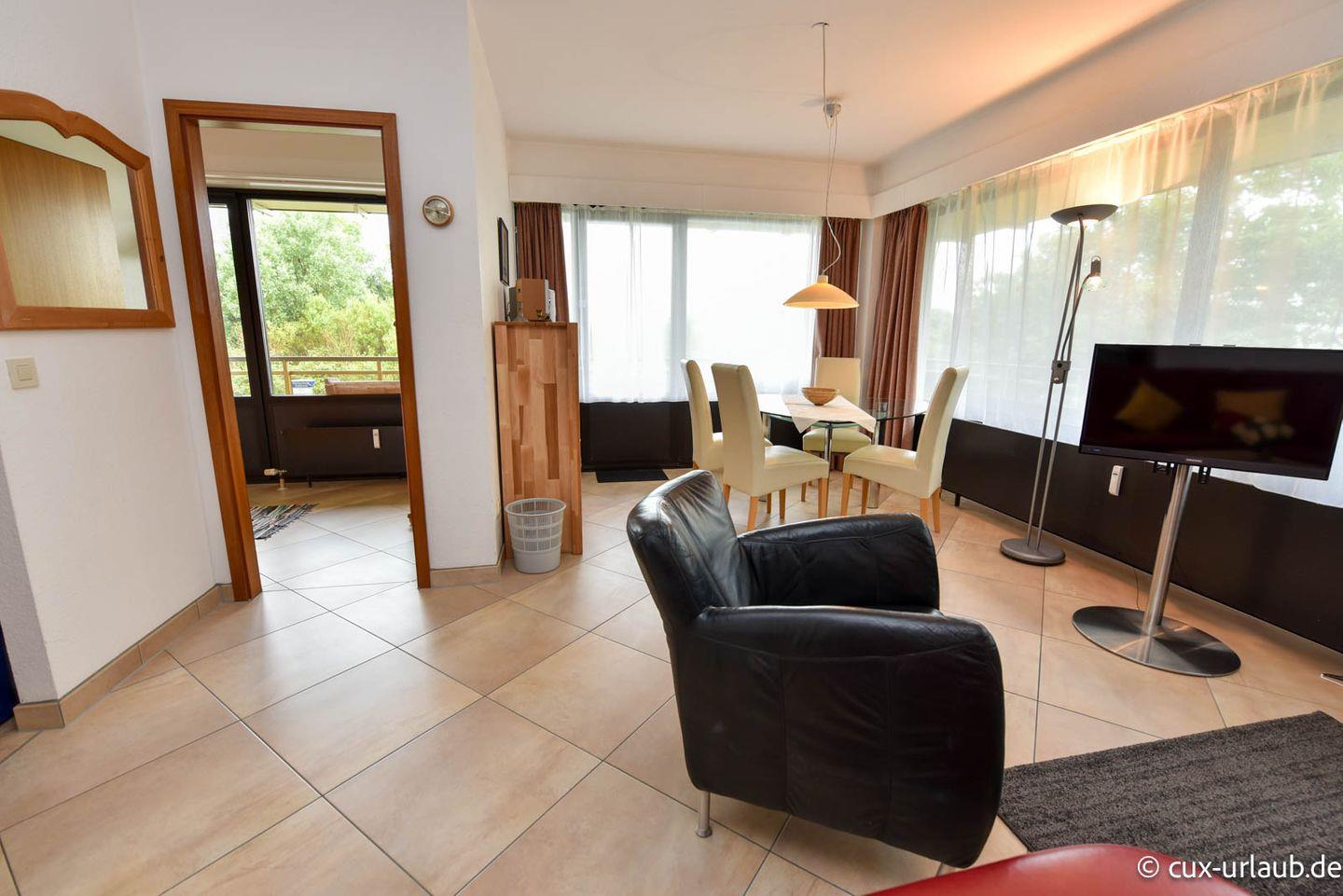3-Zimmer Appartement für 4 Personen im 1. OG mit großem Nordostbalkon. Das Wohnzimmer ist u.a. mit einem Sofa und einem Esstisch mit 4 Stühlen ausgestattet. Vom Wohnbereich geht es zum Schlafraum in welchem sich Schrankbetten und die Tür zum Balkon befinden. Der zweite Schlafraum, welcher zwei Einzelbetten hat, ist vom Flur aus erreichbar. Es gibt Kabel-TV und eine Stereoanlage. In der modernen Küche befinden sich Spülmaschine, Mikrowelle und Backofen. Das geräumige Badezimmer ist mit einem Duschwannenbad ausgestattet und verfügt zudem über zwei Waschbecken. Der kostenlose Tiefgaragenstellplatz hat eine Einstellhöhe von 149cm.