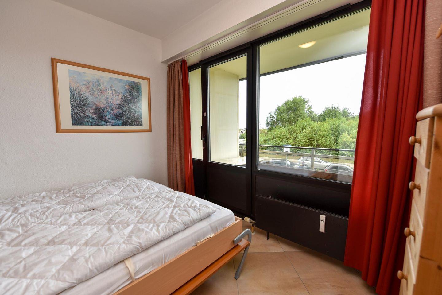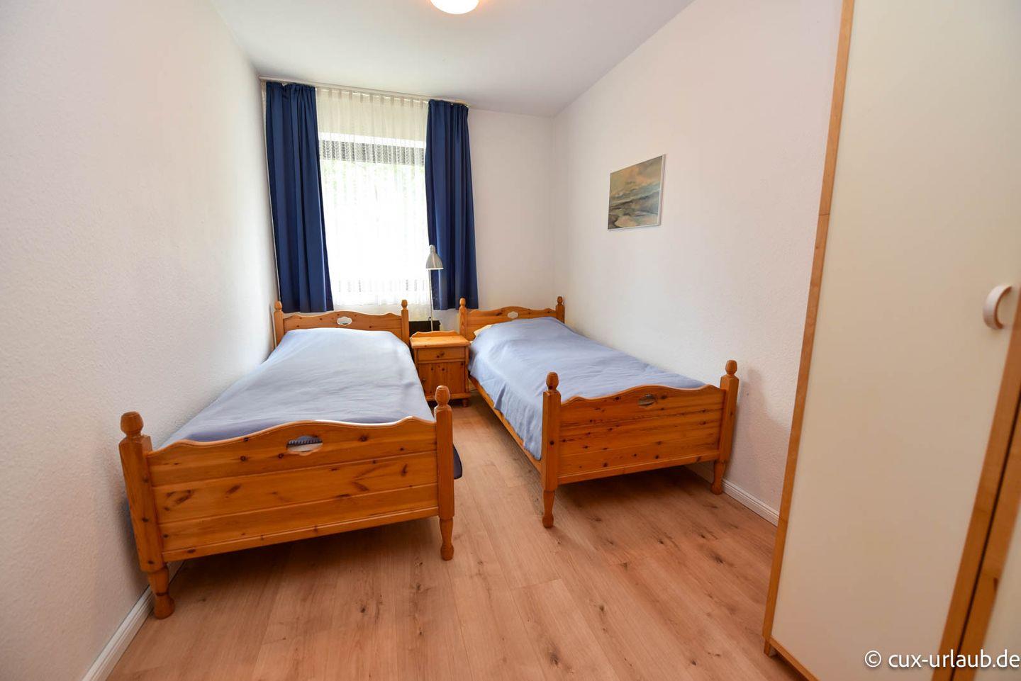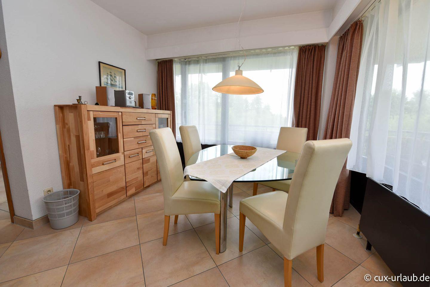 3-Zimmer Appartement für 4 Personen im 1. OG mit großem Nordostbalkon. Das Wohnzimmer ist u.a. mit einem Sofa und einem Esstisch mit 4 Stühlen ausgestattet. Vom Wohnbereich geht es zum Schlafraum in welchem sich Schrankbetten und die Tür zum Balkon befinden. Der zweite Schlafraum, welcher zwei Einzelbetten hat, ist vom Flur aus erreichbar. Es gibt Kabel-TV und eine Stereoanlage. In der modernen Küche befinden sich Spülmaschine, Mikrowelle und Backofen. Das geräumige Badezimmer ist mit einem Duschwannenbad ausgestattet und verfügt zudem über zwei Waschbecken. Der kostenlose Tiefgaragenstellplatz hat eine Einstellhöhe von 149cm.