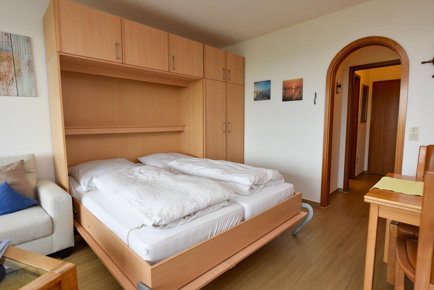 1-Zimmer Appartement im 3. OG mit Balkon und tollem Blick auf den Weltschifffahrtsweg. Dieses für 2 Personen komfortabel eingerichtete Appartement hat eine separate Küchennische. Im Wohn-/ Ess-/ Schlafbereich befindet sich ein Esszimmertisch mit 4 Stühlen, ein Schrankbett sowie ein Sofa. Im Bad finden Sie eine Dusche und das WC. Zu dem Appartement gehört auch ein Tiefgaragenplatz mit einer Einstellhöhe bis 149 cm. Zusätzlich stellen wir unseren Gästen einen Parkausweis für den städtischen Parkplatz direkt vor dem Haus zur Verfügung. Ihren Parkausweis erhalten Sie bei Ihrer Anreise an unserer Rezeption. Bitte geben Sie diesen zusammen mit den Schlüsseln bei Ihrer Abreise dort wieder ab.