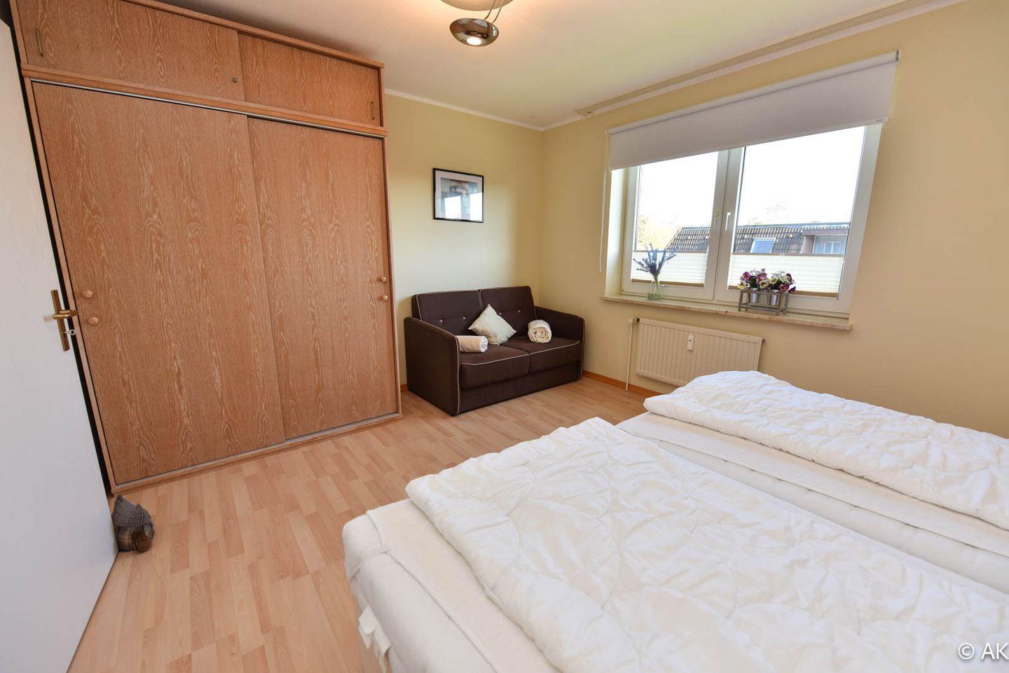 Im geräumigen Schlafzimmer sorgt ein komfortables Doppelbett, Einbauschränke, ein Wandspiegel und eine ausziehbare Schlafcouch für zwei Personen für optimale Erholung. Zusätzlich bieten wir Ihnen kostenfreie Telefonate ins deutsche Festnetz an.