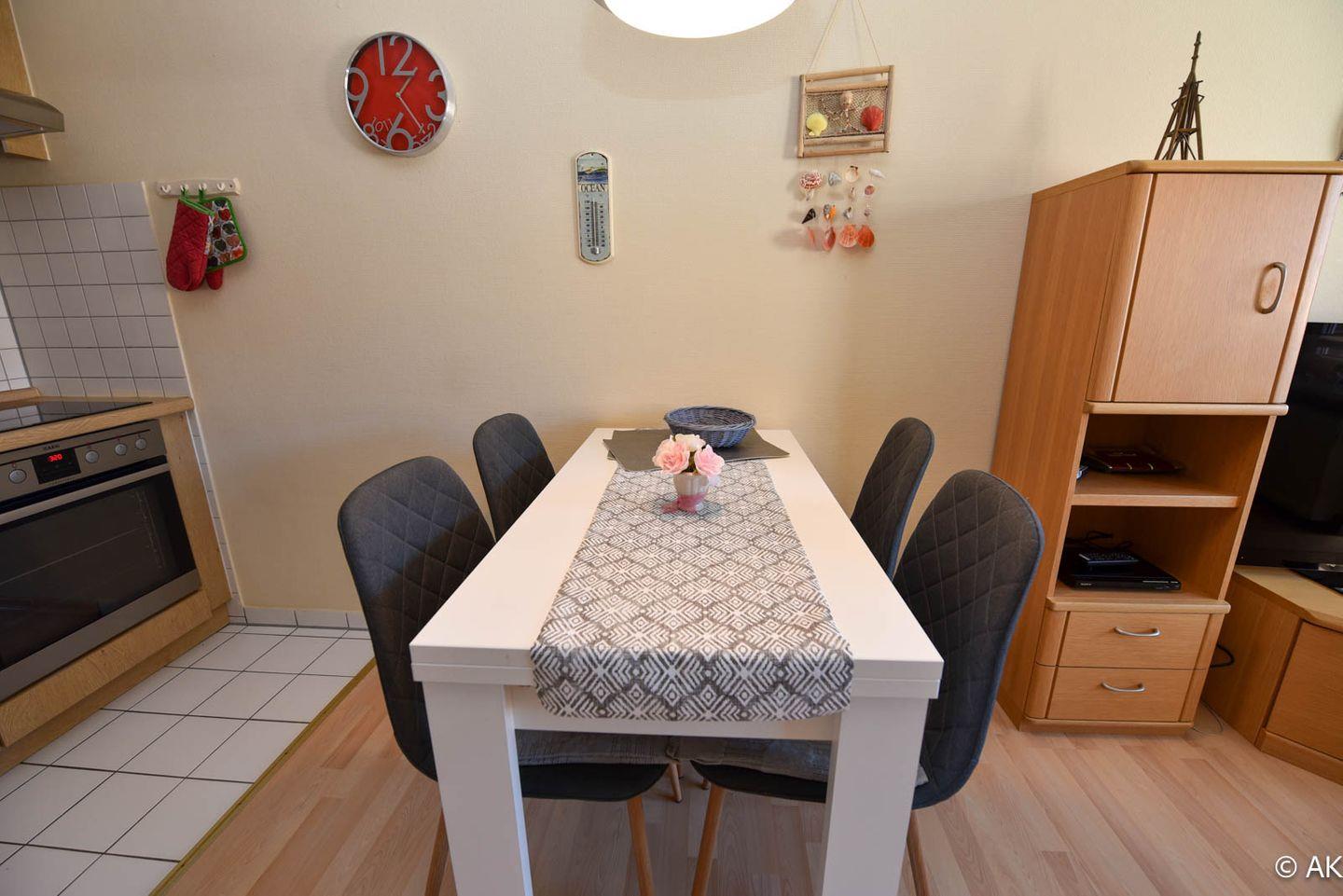 Die Ferienwohnung ist in einen Wohn- und Essbereich aufgeteilt, der eine vollständig ausgestattete Küchenzeile und eine moderne Sitzgruppe für bis zu vier Personen umfasst. Für Unterhaltung an regnerischen Tagen sorgen eine Auswahl an Spielen, ein DVD-Player und eine kleine HIFI-Anlage. Die behagliche Sesselecke mit einer ausziehbaren Ledercouch bietet den idealen Platz für entspannte Fernsehabende.